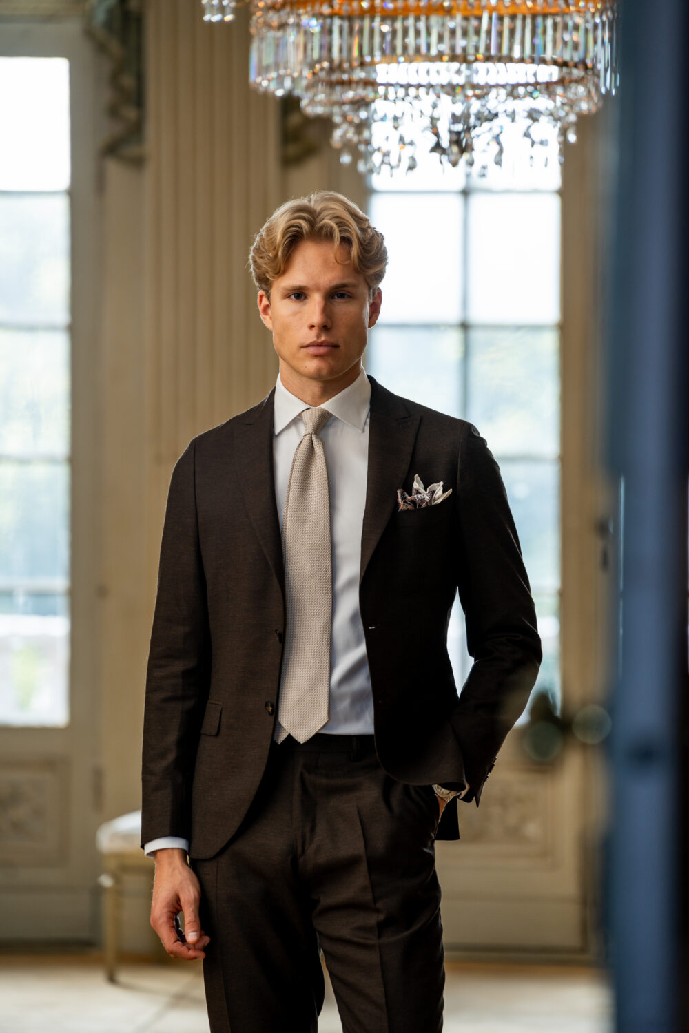 Dieser stilvolle Hochzeitsanzug in edlem Braun ist die perfekte Wahl fรผr den modernen Brรคutigam, der Wert auf Eleganz und Individualitรคt legt. Die schlanke, kรถrperbetonte Passform sorgt fรผr eine markante Silhouette und unterstreicht einen selbstbewussten, souverรคnen Auftritt am groรen Tag.
