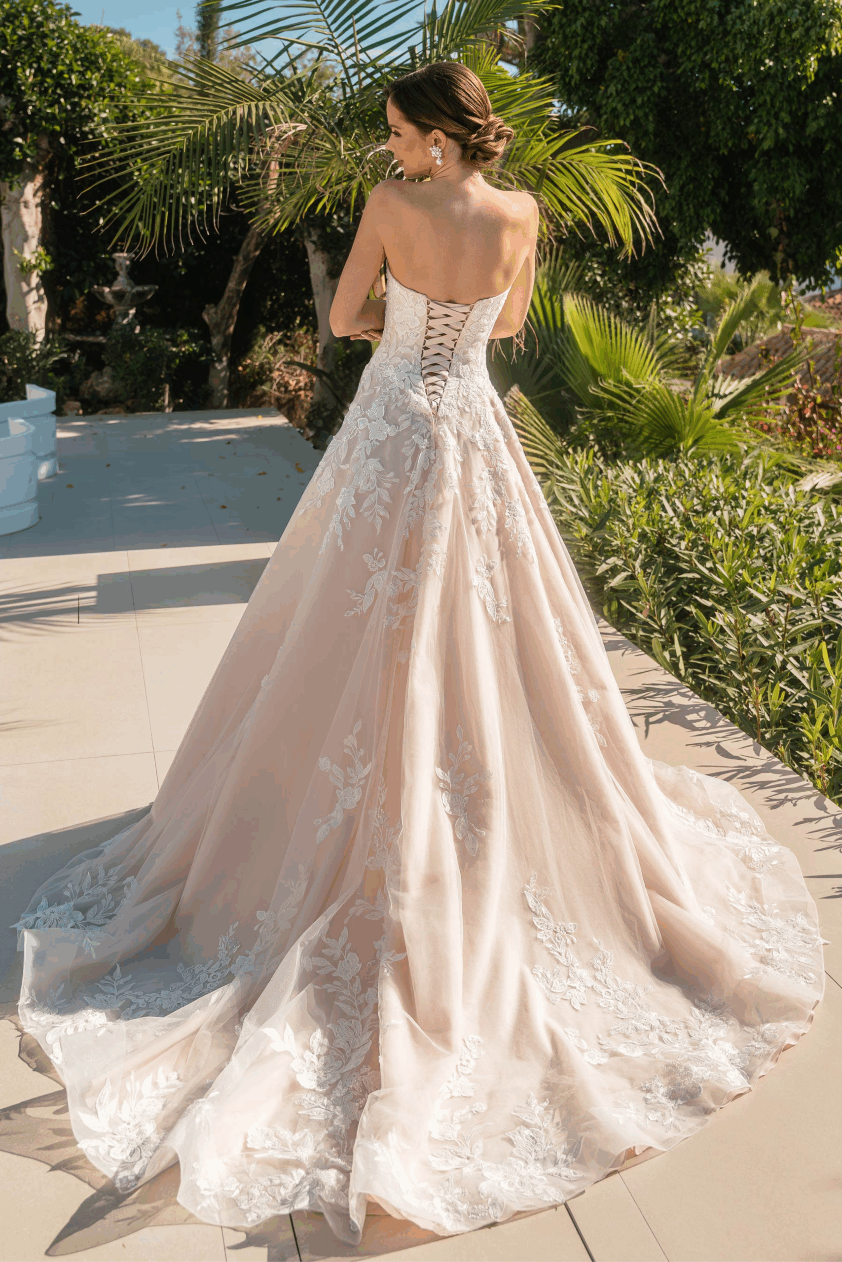 Der voluminรถse Rock aus mehreren Lagen Tรผll sorgt fรผr ein mรคrchenhaftes Volumen und schimmert im Sonnenlicht sanft โ ideal fรผr eine Sommerhochzeit im Freien oder eine festliche Feier mit luxuriรถsem Flair. Die blushfarbene Basis verleiht dem Look eine moderne, feminine Note und lรคsst die Spitzenmotive besonders schรถn zur Geltung kommen.