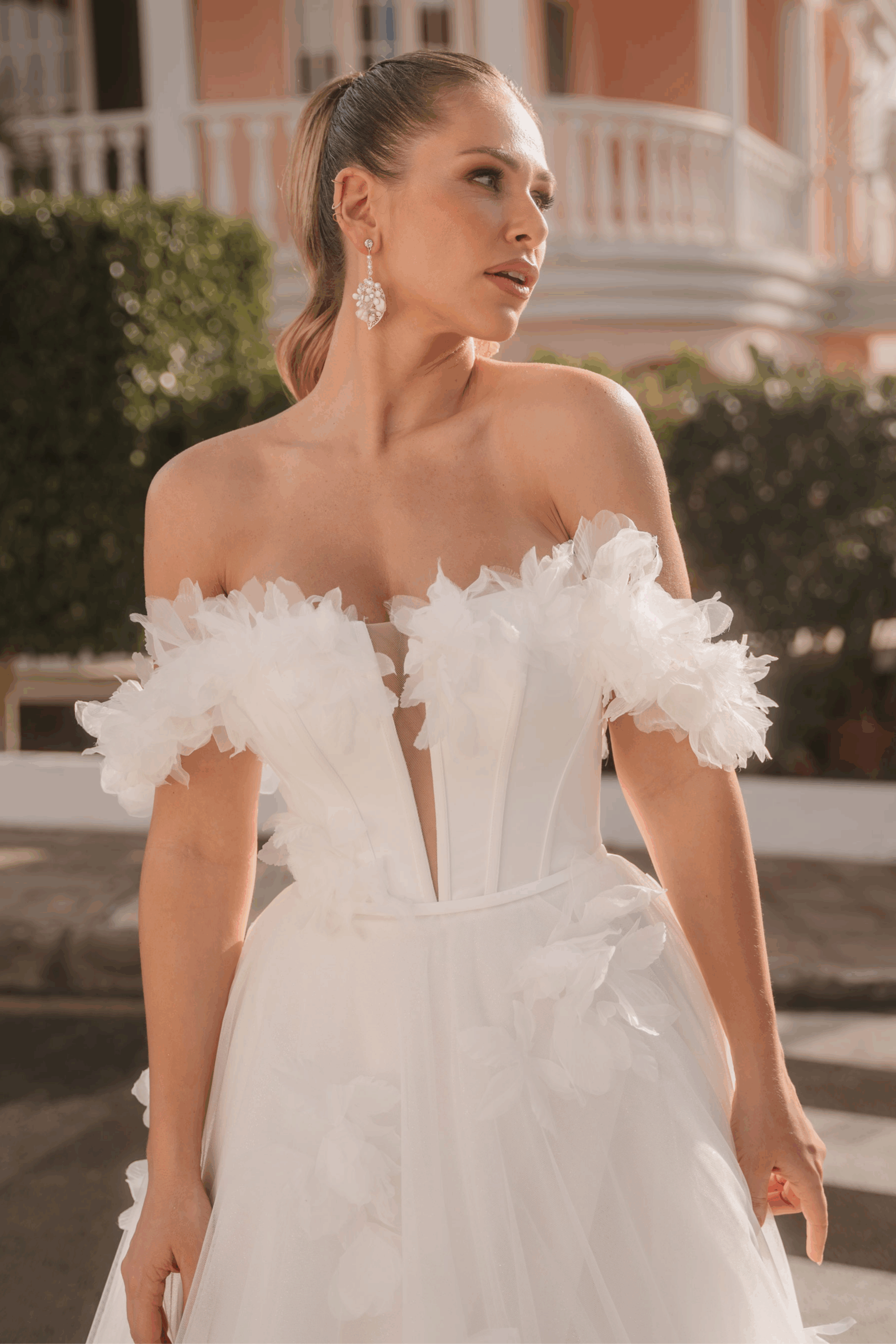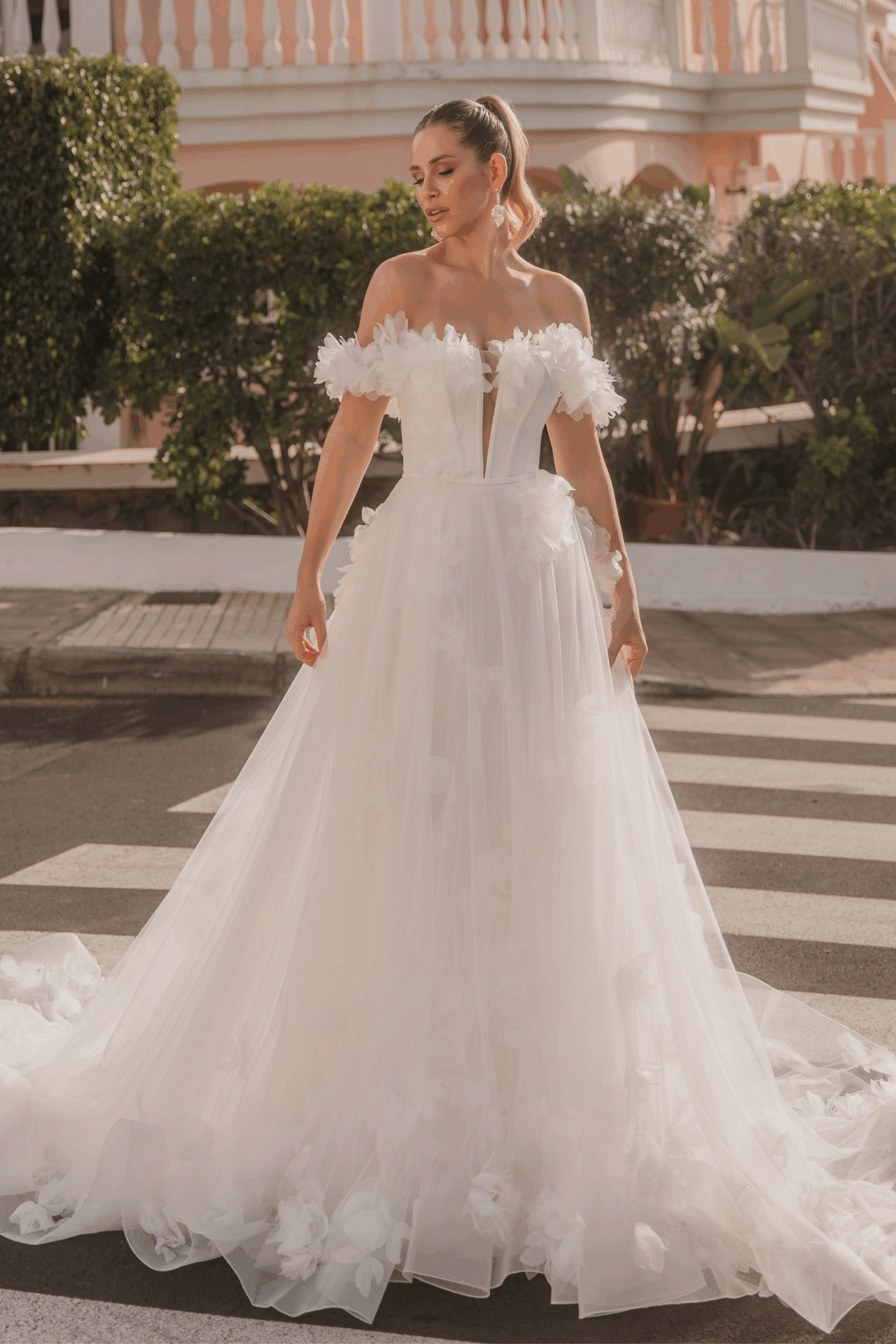 Dieses romantische Off-Shoulder-Brautkleid verzaubert mit zartem Softtรผll und verspielten 3D-Blรผtenapplikationen. Der feminine, tief ausgeschnittene Ausschnitt betont das Dekolletรฉ und geht elegant in einen weich flieรŸenden A-Linien-Rock รผber.