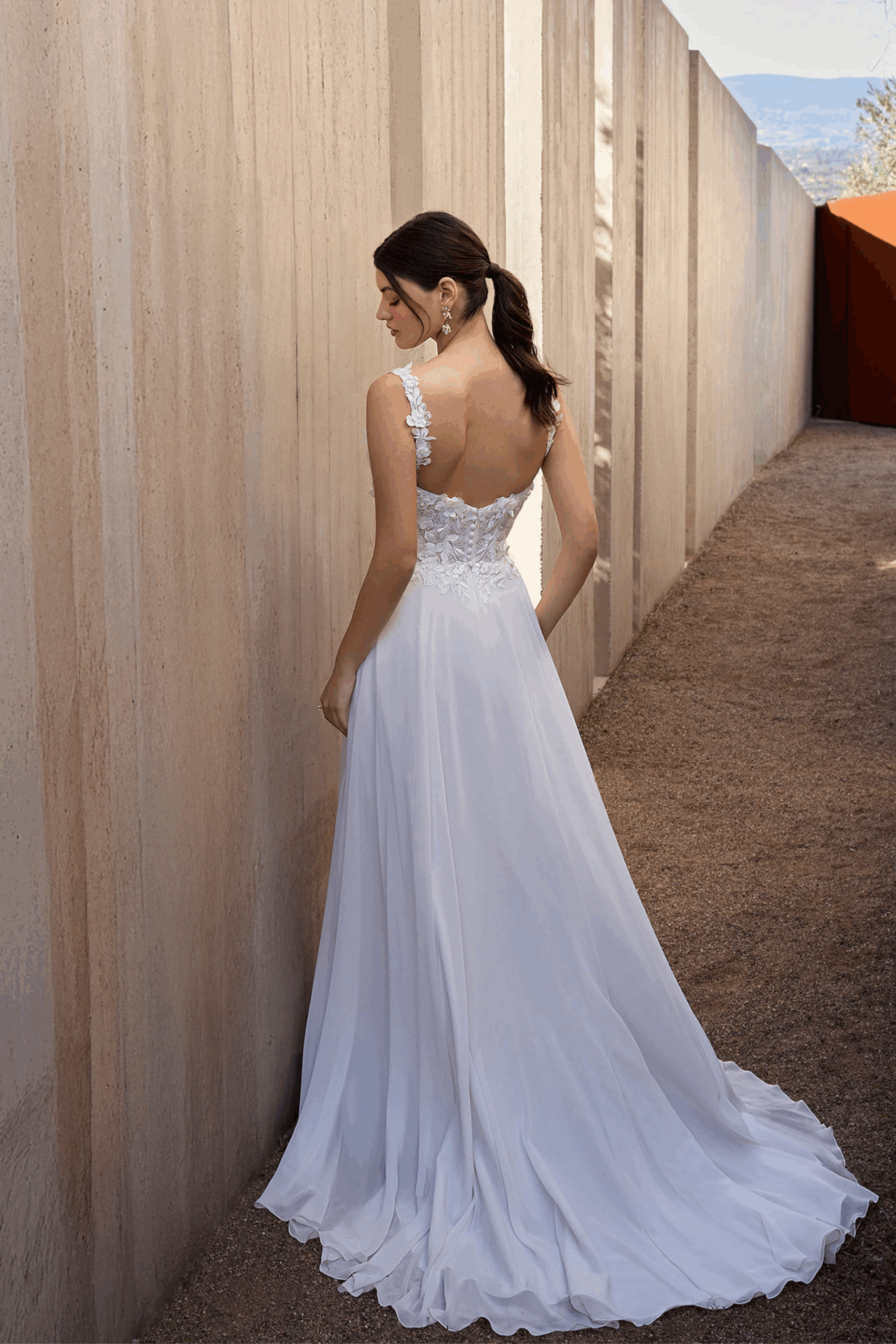 Zarte Romantik trifft auf schlichte Eleganz โ das Orea Sposaย ist ein Traum fรผr Brรคute, die Natรผrlichkeit und feminine Raffinesse lieben.