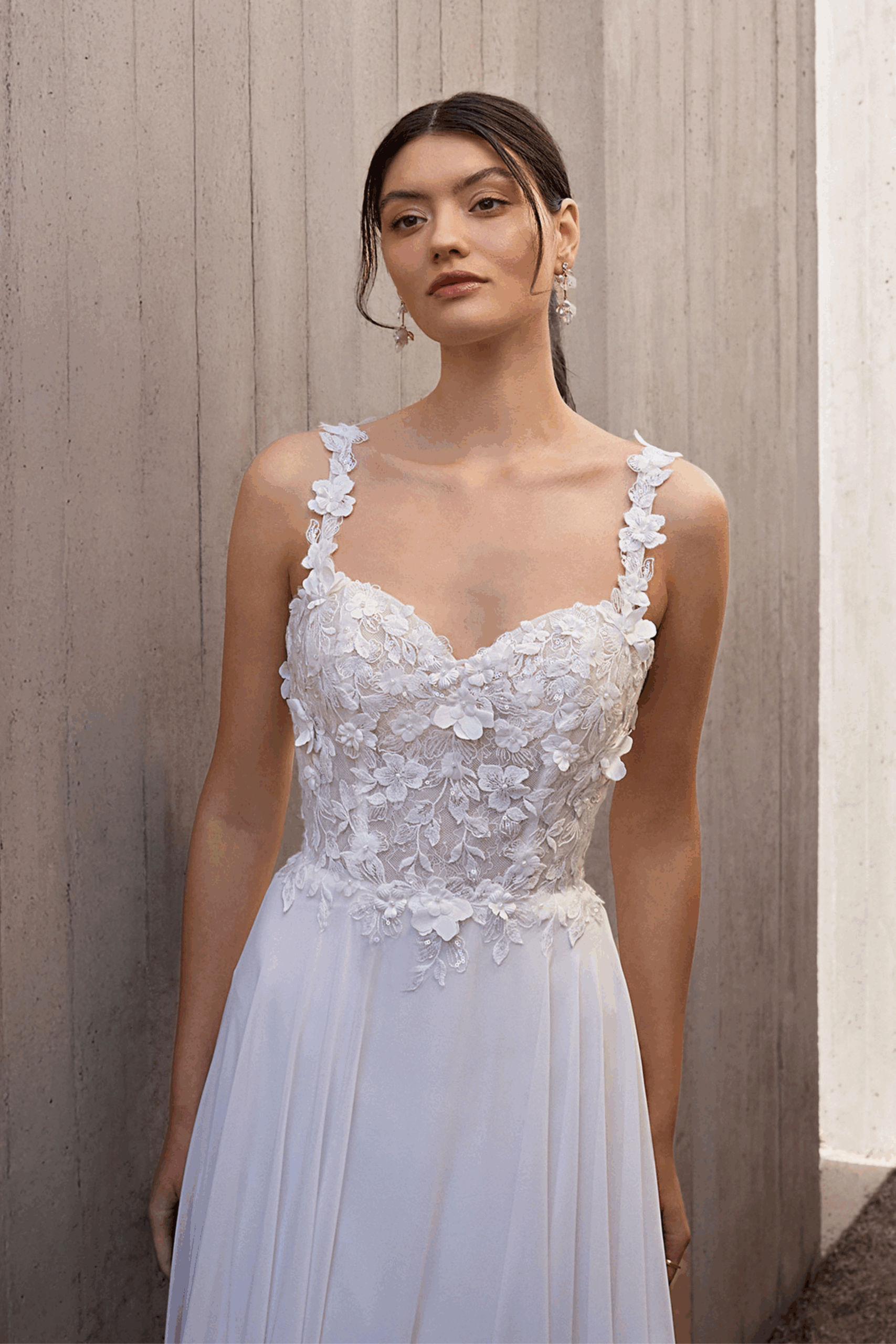 Das Oberteil aus feiner floraler Spitze mit dezentem Glitzereffekt und liebevoll gearbeiteten 3D-Blรผten verleiht dem Kleid eine romantische Leichtigkeit. Die zarten Spitzentrรคger gehen harmonisch in den sanft flieรenden Chiffonrock รผber, der mit seiner leichten Schleppe bei jedem Schritt anmutig mitschwingt.