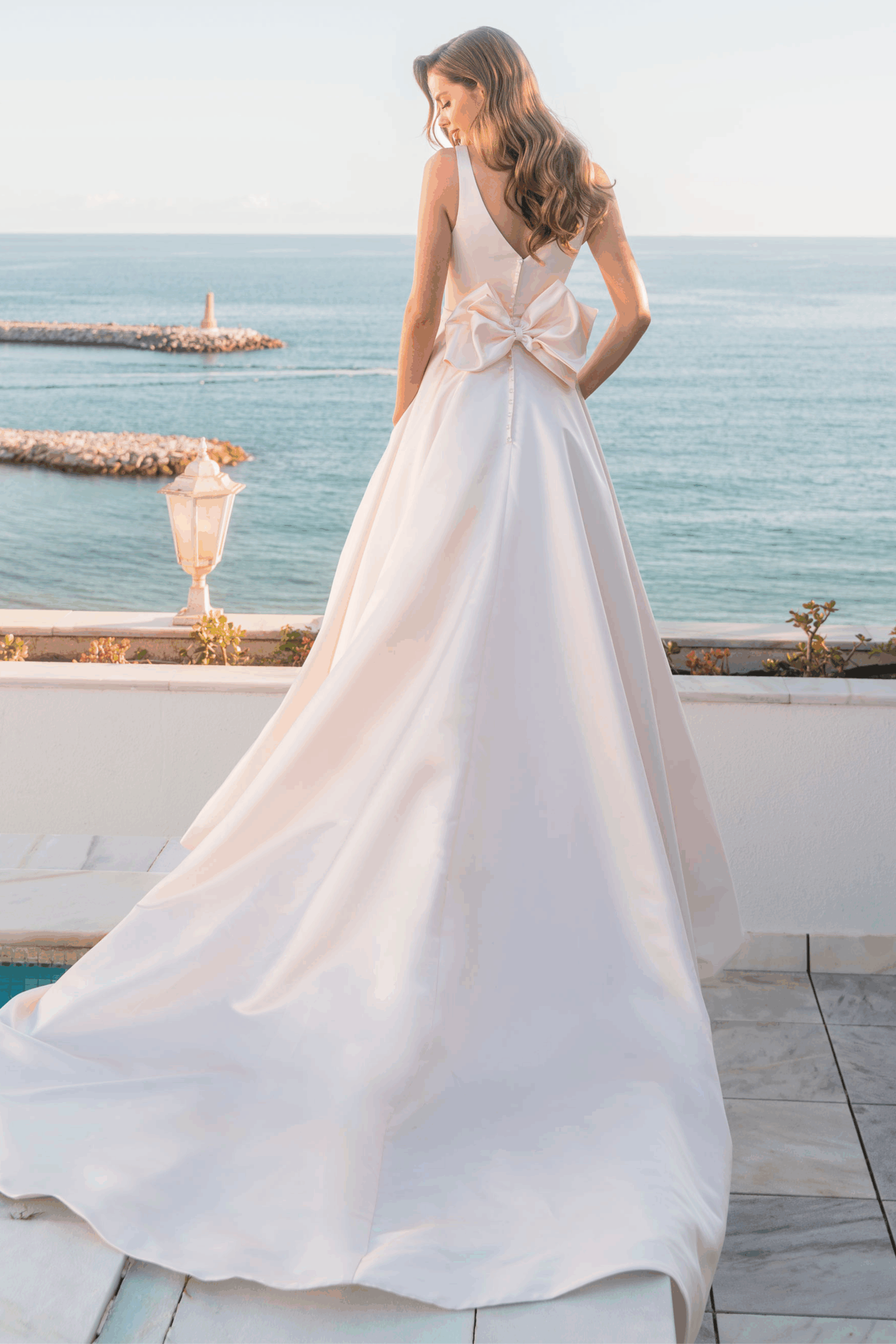 Der tiefe V-Ausschnitt vorn und hinten sorgt fรผr einen modernen, femininen Akzent, wรคhrend der zarte Taillengรผrtel die Figur elegant betont. Der voluminรถse Rock fรคllt in weichen Falten zu Boden und verleiht dem Kleid eine kรถnigliche Ausstrahlung โ perfekt fรผr eine Hochzeit am Meer, im Schloss oder in einer modernen Location.