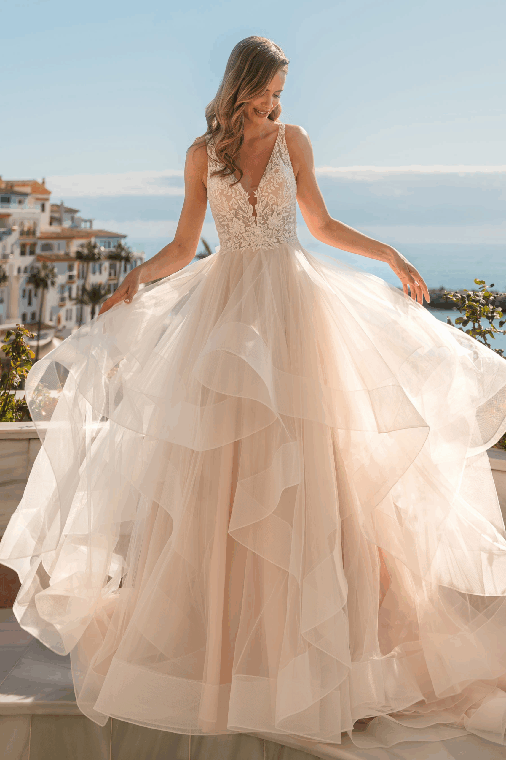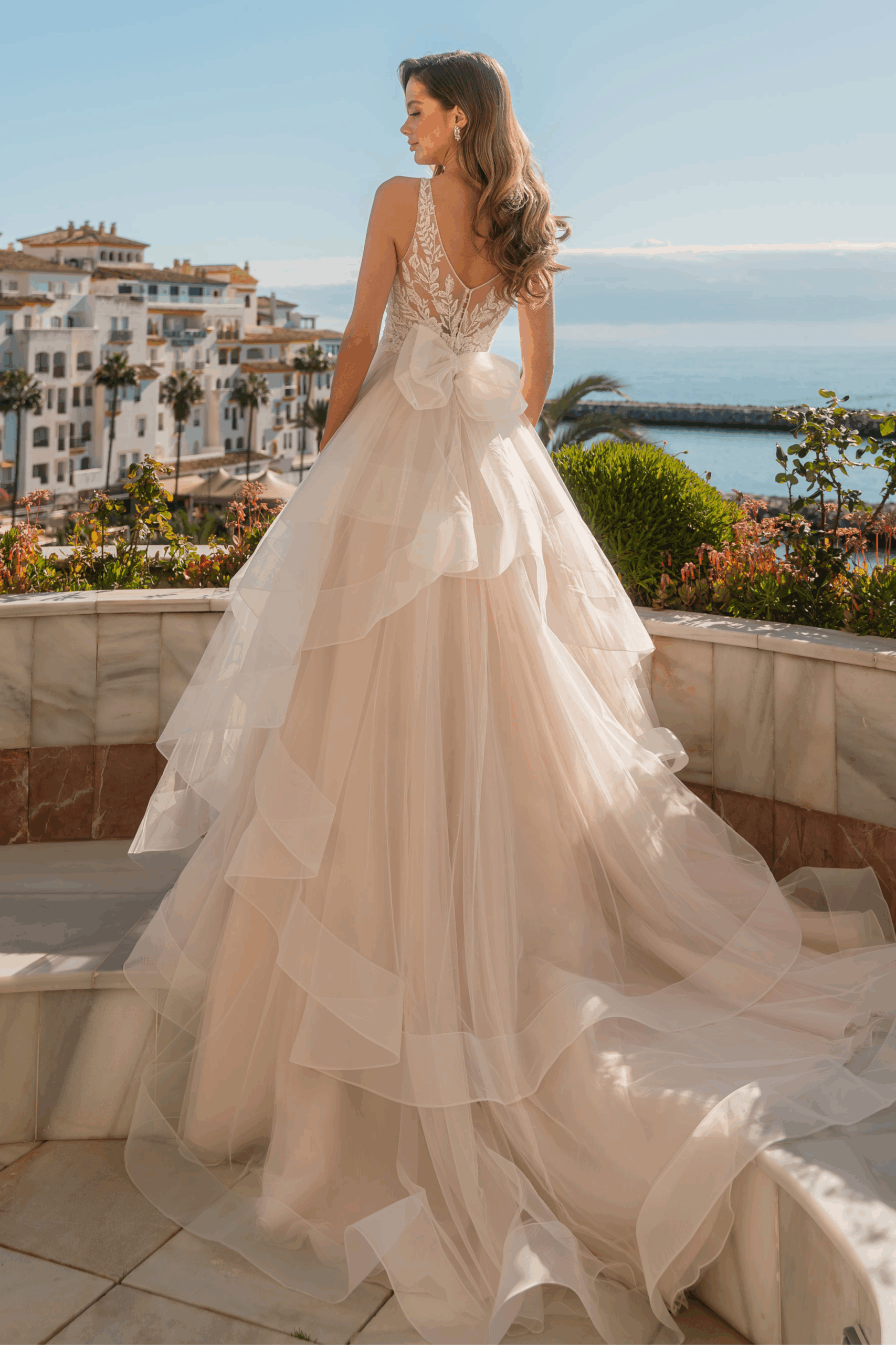 Das sanfte Blush-Nude unter dem Tรผll sorgt fรผr Wรคrme und Tiefe, wรคhrend das Licht das Kleid zum Strahlen bringt โ ideal fรผr eine romantische Hochzeit mit mediterranem Flair oder am Meer.