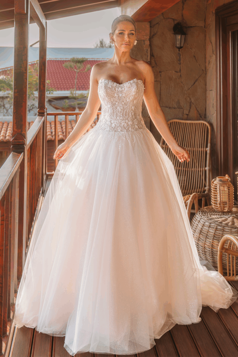 Dieses zauberhafte Brautkleid verleiht jeder Braut eine mรคrchenhafte Ausstrahlung. Das trรคgerlose Korsagen-Oberteil ist mit zarter Spitze und funkelnden Perlen verziert, die sanft im Licht schimmern und das Dekolletรฉ elegant betonen. Der voluminรถse Tรผllrock fรคllt weich und flieรend zu Boden und sorgt fรผr einen romantischen Prinzessinnen-Look. Ein Kleid, das durch seine Kombination aus Glanz, Leichtigkeit und klassischer Eleganz begeistert.