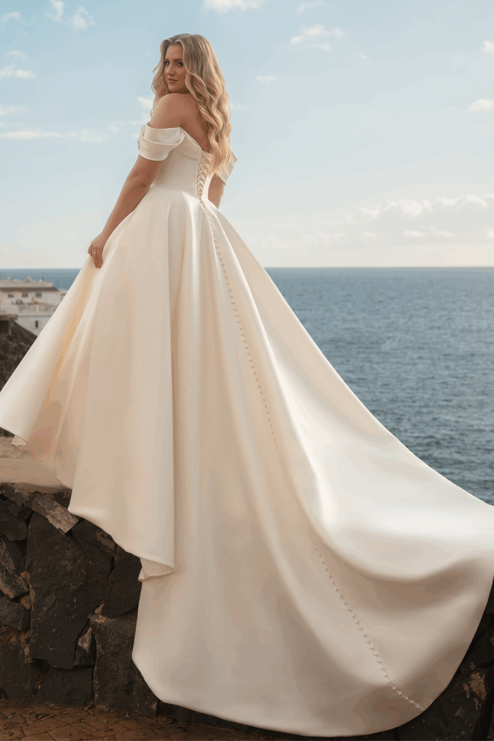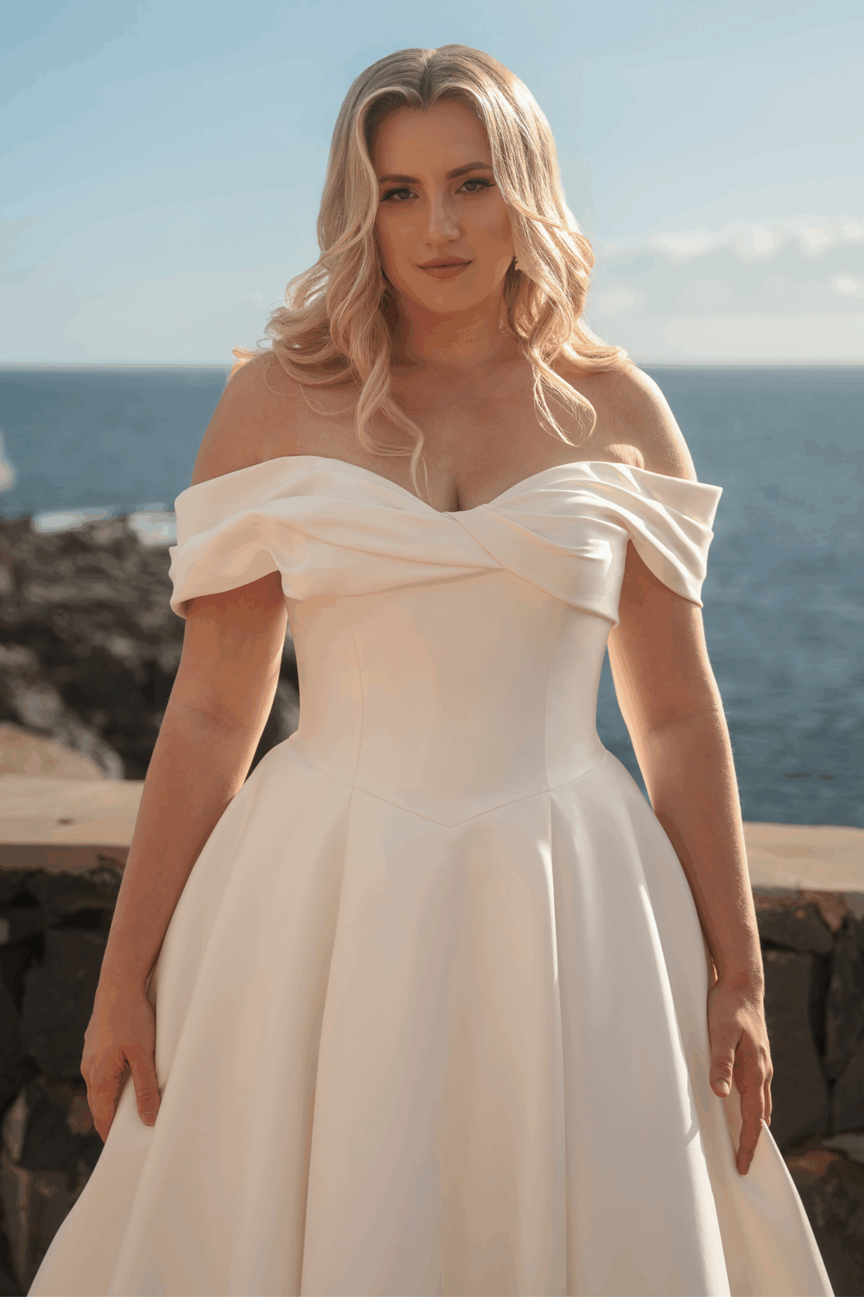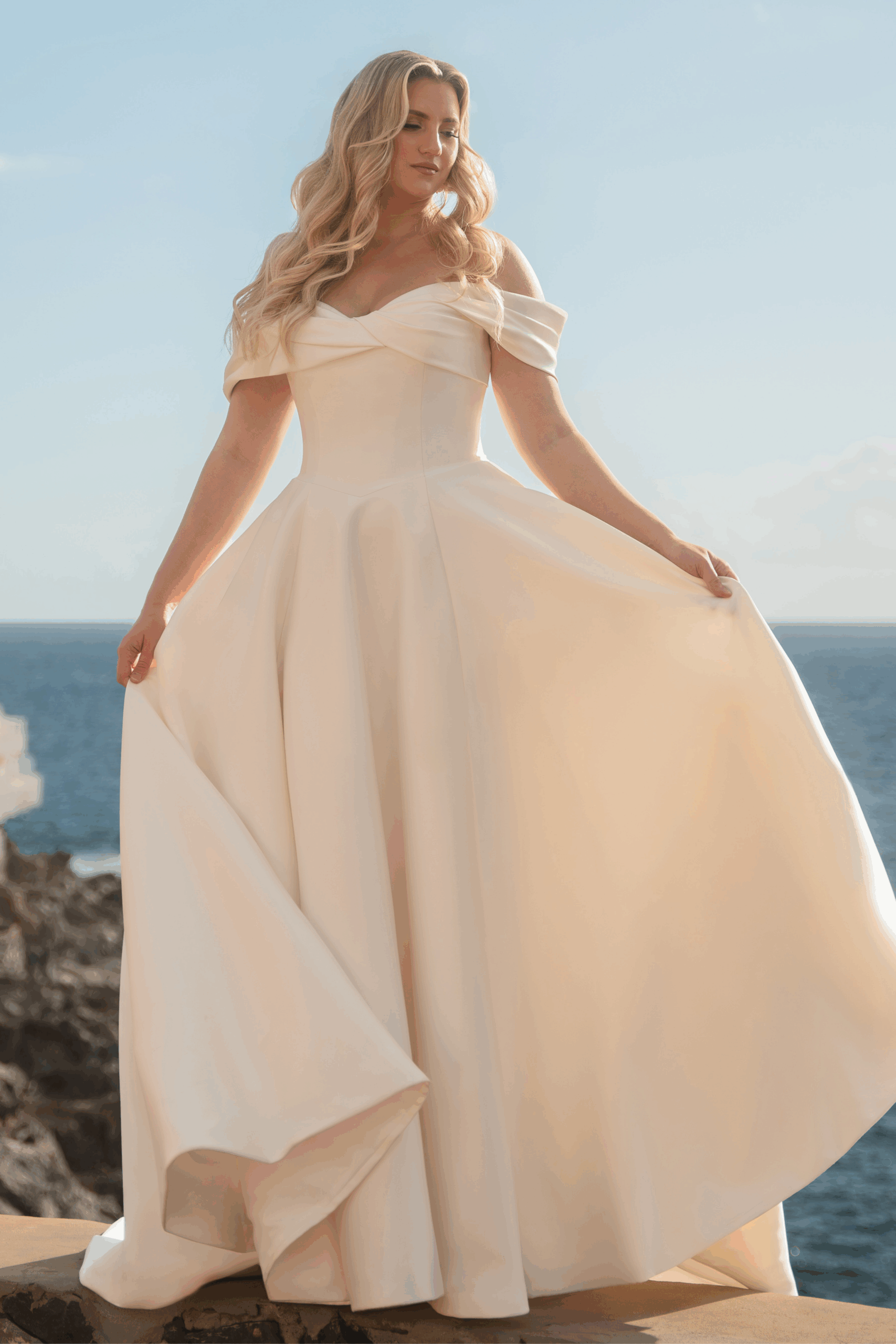 Dieses Brautkleid strahlt pure Eleganz und zeitlose Schรถnheit aus. Das schulterfreie Design mit sanft รผberkreuztem Dekolletรฉ betont das Dekolletรฉ auf edle Weise und verleiht dem Look eine romantische Note. Der flieรŸende Rock aus hochwertigem Stoff fรคllt in weichen Bahnen und sorgt fรผr eine anmutige Silhouette, die jeder Bewegung Leichtigkeit verleiht. Ein Kleid, das klassische Schlichtheit mit moderner Raffinesse verbindet โ€“ perfekt fรผr einen stilvollen Auftritt am groรŸen Tag.