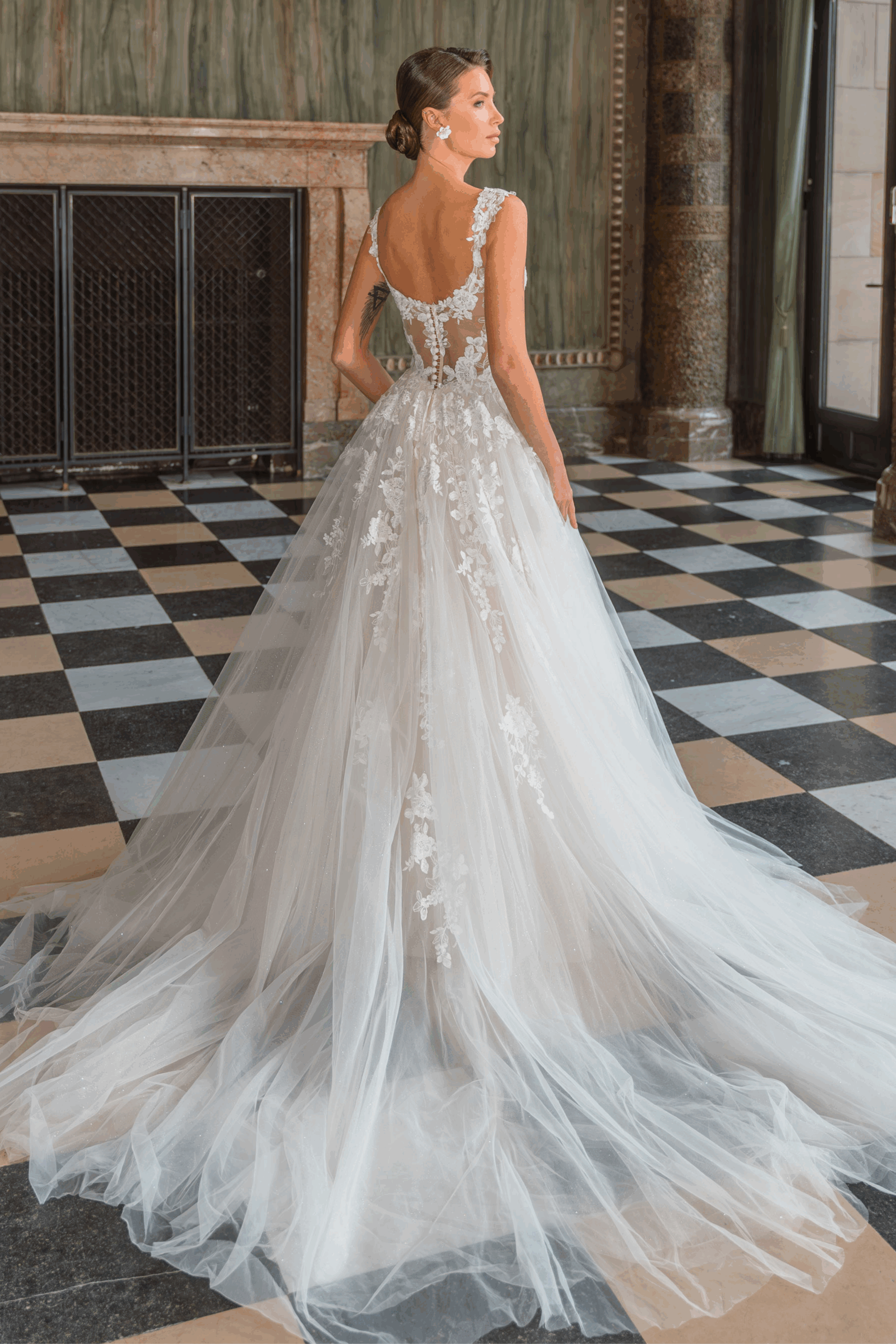 Dieses atemberaubende Brautkleid verbindet klassische Romantik mit moderner Leichtigkeit. Das semi-transparente Mieder aus feiner Spitze mit tiefem V-Ausschnitt ist kunstvoll mit floralen Applikationen verziert, die sanft in den luftigen Tรผllrock รผbergehen. Zarte Trรคger betonen die Schultern und verleihen dem Look eine elegante, feminine Silhouette.