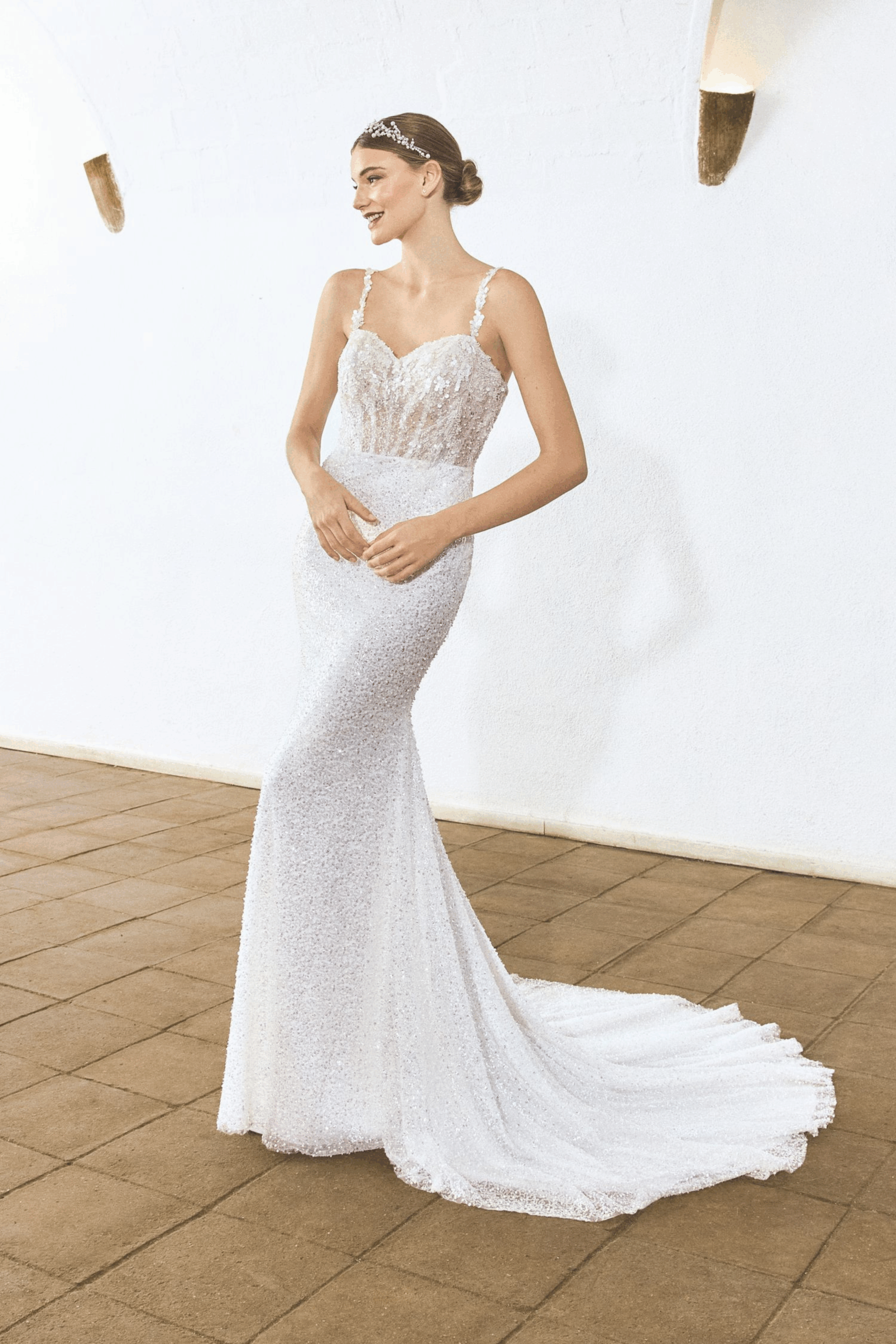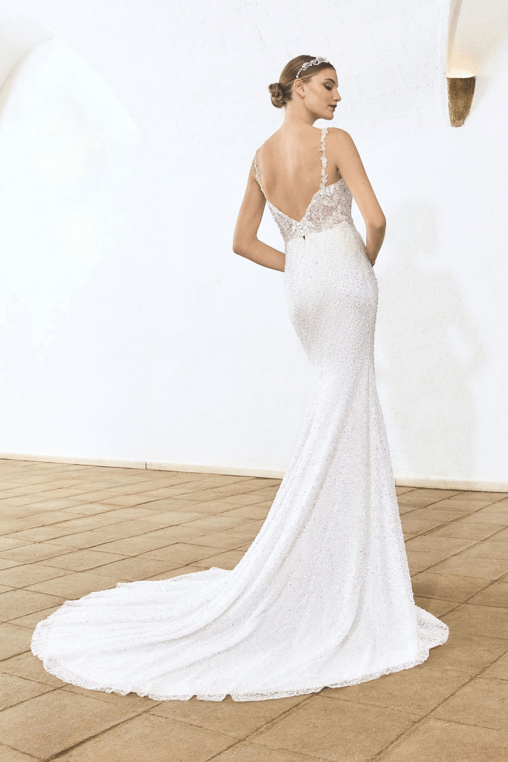 Ein echter Blickfang: Dieses Mermaid-Kleid mit Herz-Ausschnitt und offenem Rรผcken vereint bestickten Tรผll und Spitze zu einem Look, der romantisch und glamourรถs zugleich ist.