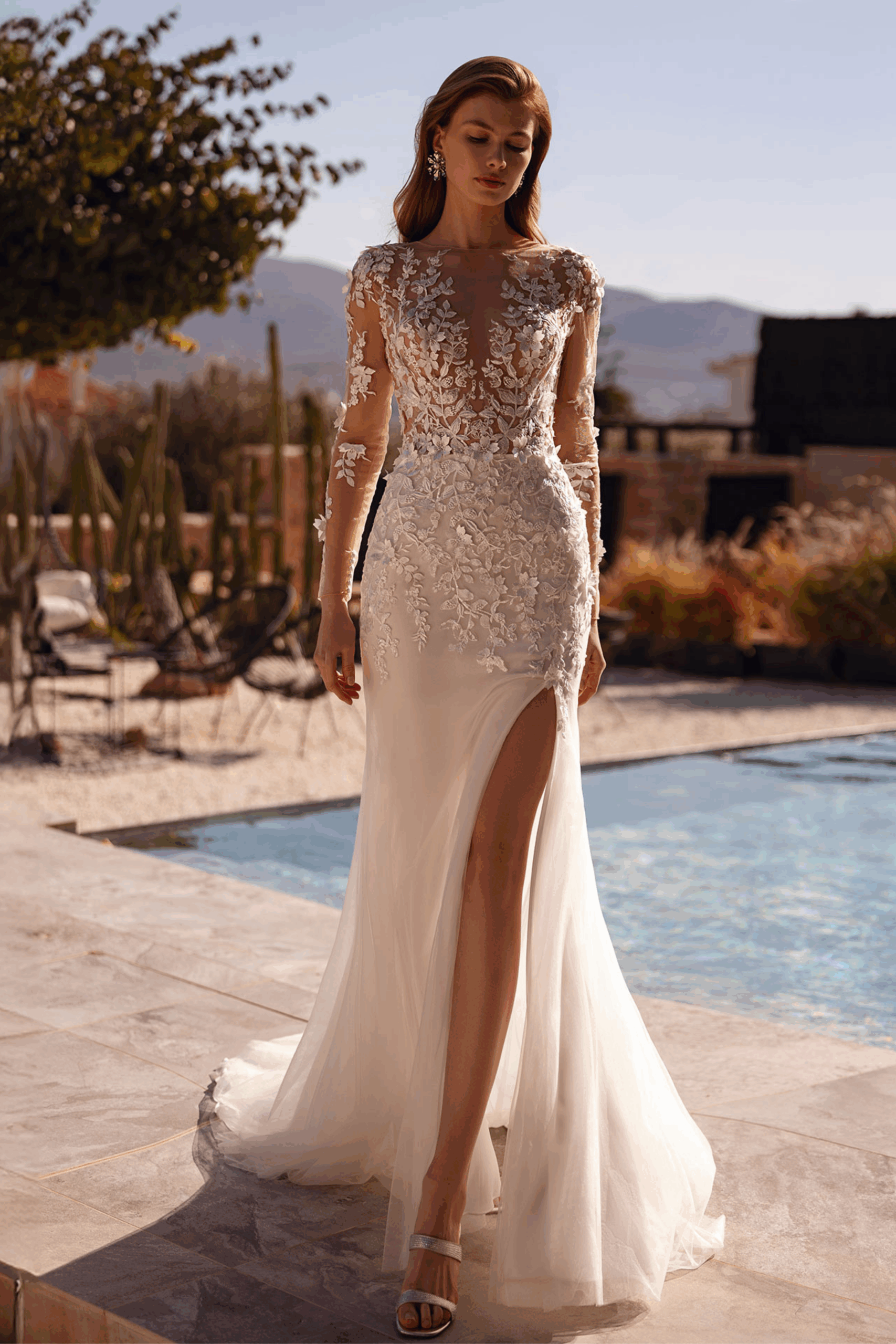 Ein Brautkleid, das pure Eleganz und moderne Sinnlichkeit vereint โ das Demetrios Modell besticht durch seine raffinierte Kombination aus Transparenz, Spitze und flieรendem Tรผll.