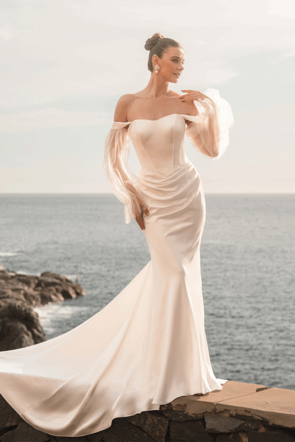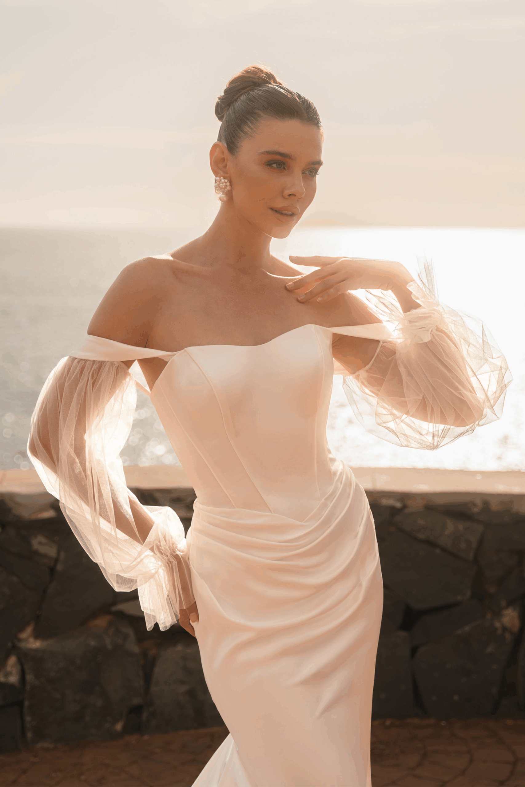 Dieses Brautkleid verkรถrpert pure Eleganz mit einem Hauch von Dramatik. Das enganliegende, satinartige Mieder formt eine feminine Silhouette und betont die Taille auf edle Weise. Besonders auffรคllig sind die abnehmbaren, transparenten Puffรคrmel aus feinem Tรผll, die dem modernen, schulterfreien Design einen romantischen und zugleich kรถniglichen Charakter verleihen. Die sanften Drapierungen im Taillenbereich schaffen einen flieรenden รbergang zum Rock und sorgen fรผr eine schmeichelhafte Passform. Ein Kleid, das Anmut, Stil und zeitlose Schรถnheit perfekt vereint โ ideal fรผr Brรคute, die eine elegante, aber zugleich auรergewรถhnliche Ausstrahlung wรผnschen.