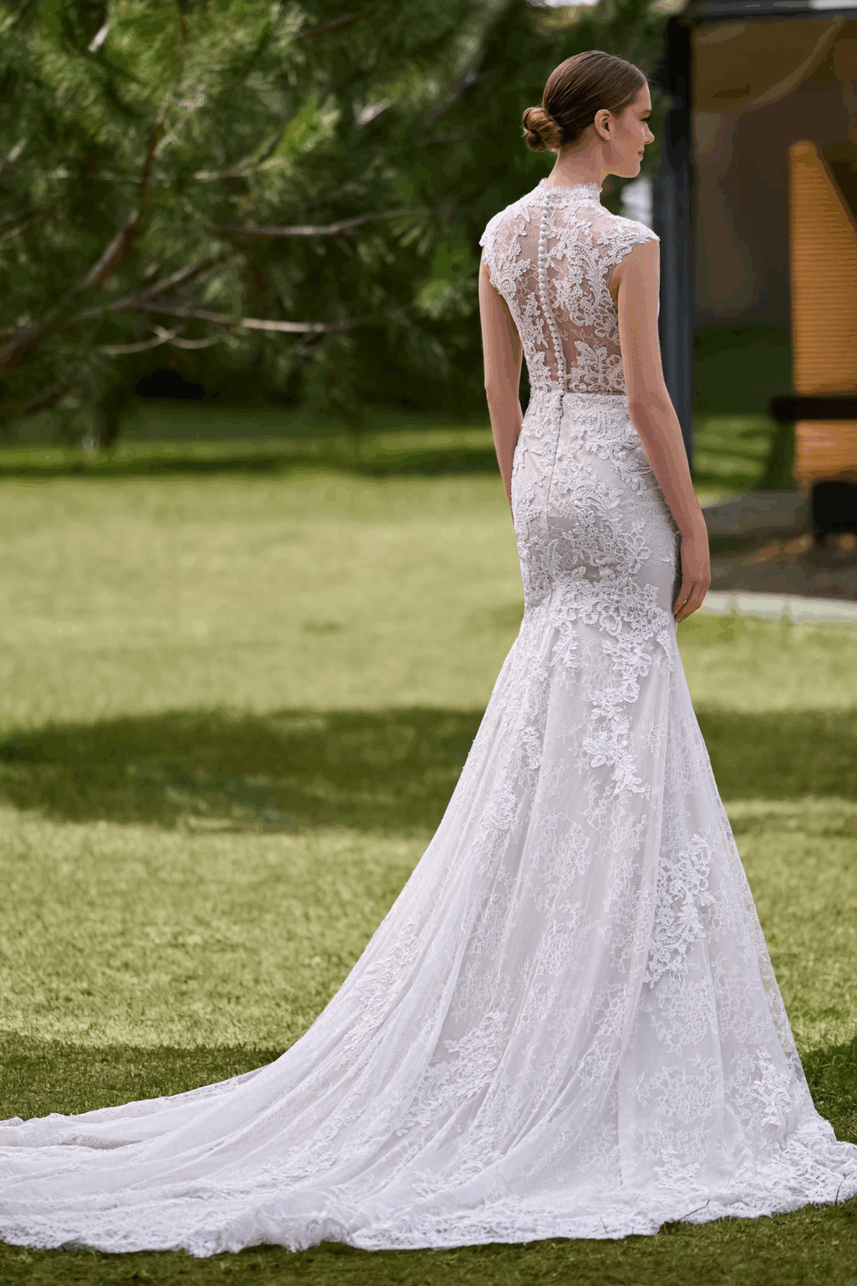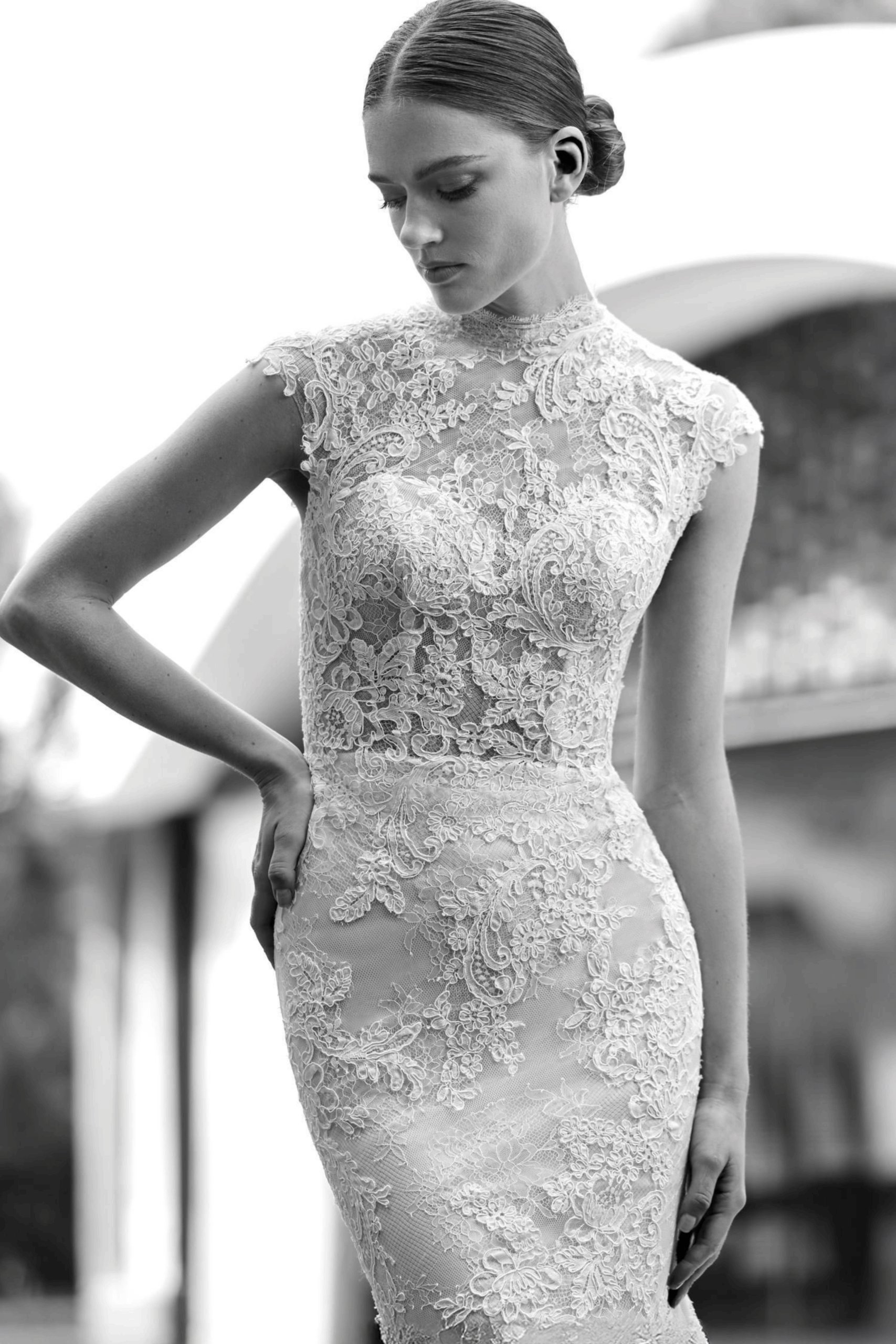 Dieses Meerjungfrauenkleid mit hohem Kragen und transparentem Spitzenoberteil ist eine sinnliche und elegante Kreation. Chantilly spielt die Hauptrolle, enthรผllt die Haut mit subtiler Raffinesse und formt eine Silhouette, die Struktur und Leichtigkeit meisterhaft vereint.