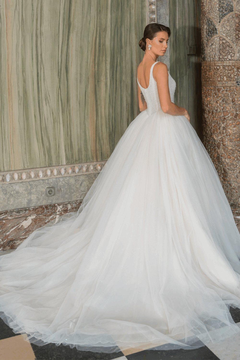 Der weit ausgestellte Tüllrock fällt in weichen, luftigen Schichten und sorgt für einen majestätischen Auftritt. Die breiten Träger und der elegante Rundhalsausschnitt verleihen dem Kleid einen klassischen und gleichzeitig modernen Charakter.