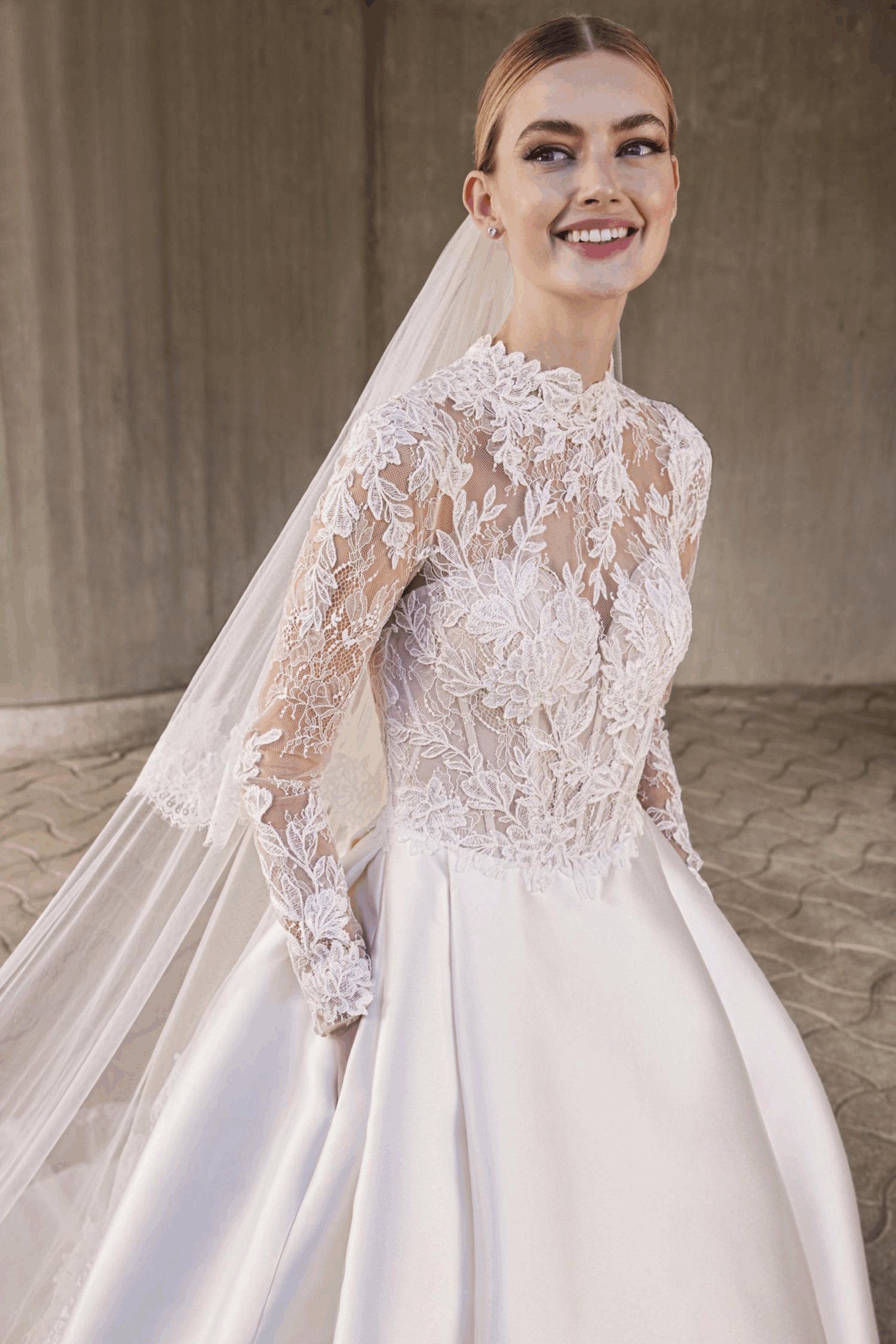 Ein Prinzessinnenkleid mit hohem Halsausschnitt und langen รrmeln, aus Mikado, Chantilly und Corded Lace โ eine gelungene Mischung aus Tradition und moderner Eleganz fรผr einen klassischen, kรถniglichen Auftritt.
