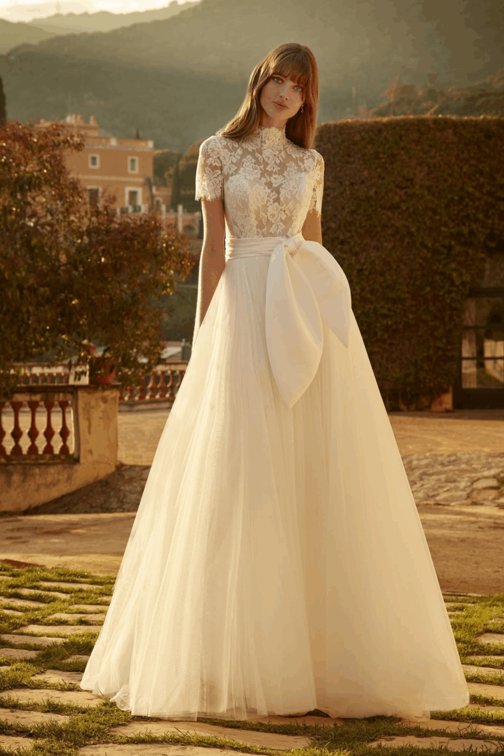 Dieses kurzรคrmelige Kleid mit hohem Ausschnitt und offenem Rรผcken kombiniert Mikado, Tรผll und Spitze zu einer majestรคtischen Silhouette mit einem Hauch von Leichtigkeit. Ein Entwurf, der Struktur und Fluiditรคt meisterhaft in Einklang bringt.