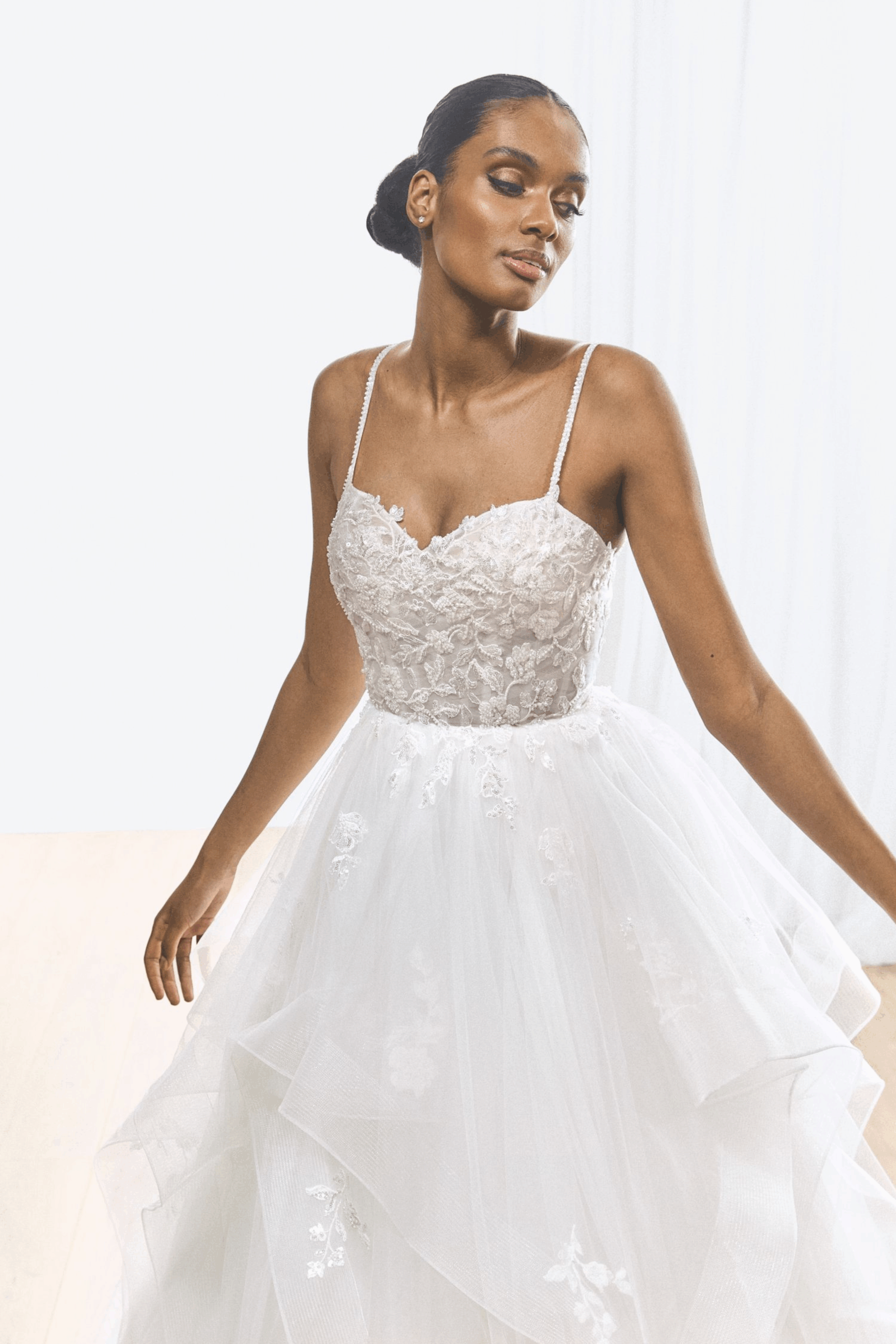 Ein romantischer Traum aus Tรผll: Dieses Prinzessinnenkleid mit Herz-Ausschnitt und offenem Rรผcken verfรผhrt mit zarten Spitzen- und Perlendetails โ ideal fรผr einen groรen Auftritt.