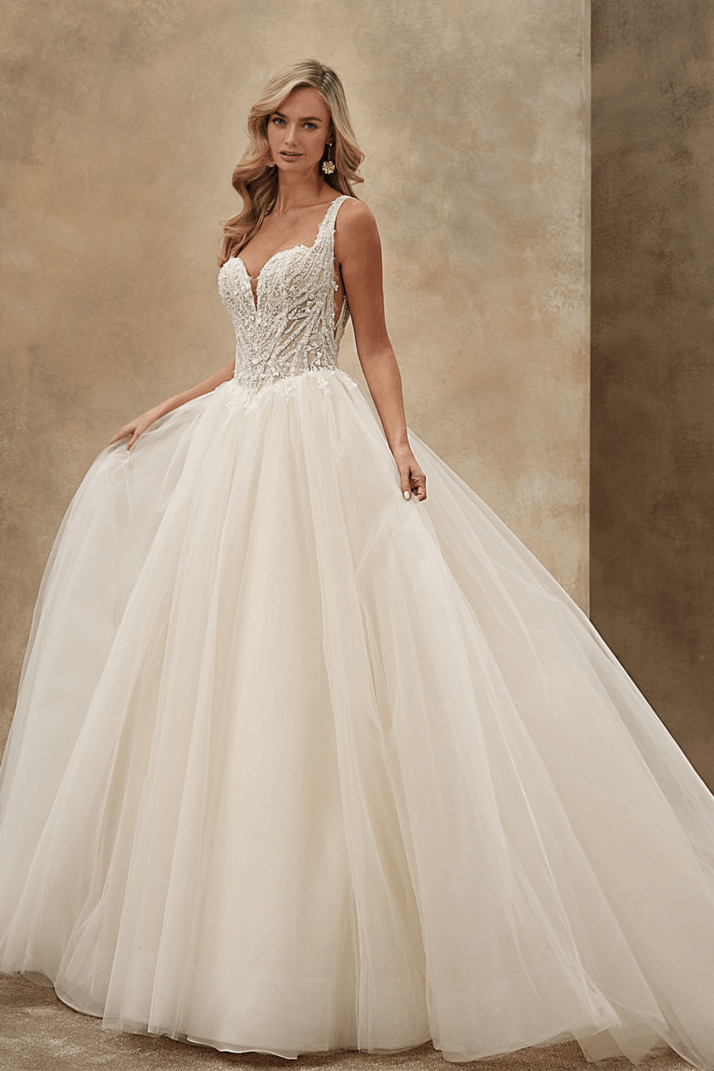 Dieses mรคrchenhafte Brautkleid von Demetrios verzaubert mit einem prachtvollen Tรผllrock und einem funkelnden Spitzenmieder. Der tiefe V-Ausschnitt und die zarten Trรคger betonen elegant das Dekolletรฉ, wรคhrend filigrane Perlen- und Paillettenapplikationen fรผr luxuriรถsen Glanz sorgen. Der voluminรถse Rock aus mehreren Lagen Tรผll schenkt dem Kleid einen kรถniglichen Auftritt โ perfekt fรผr Brรคute, die von einem echten Prinzessinnenmoment trรคumen.