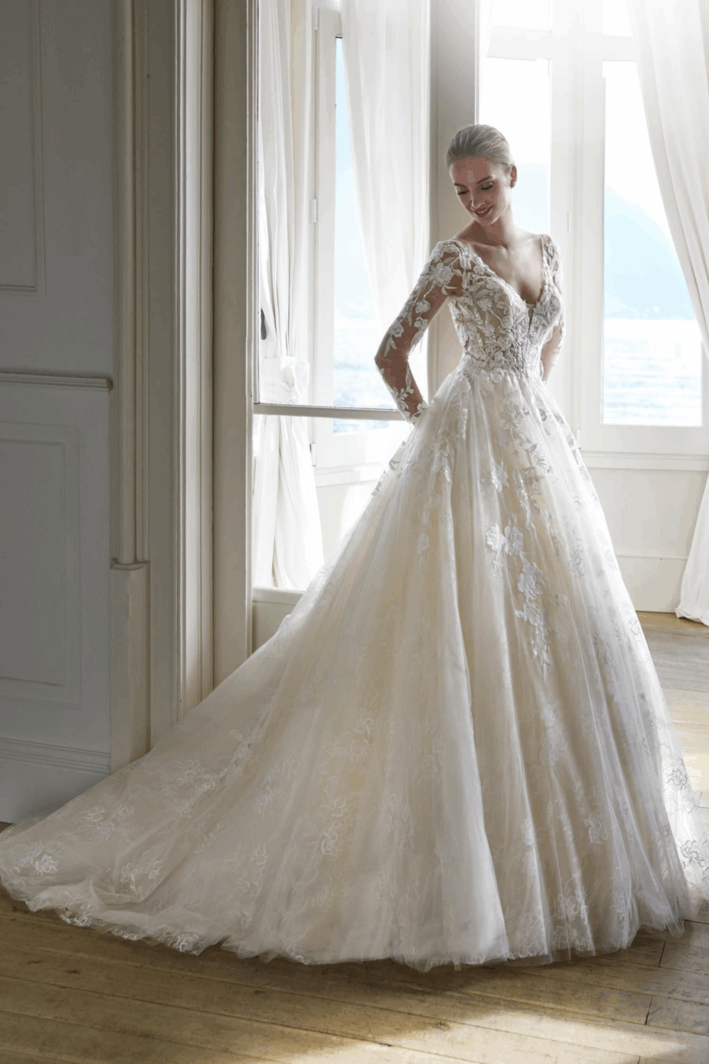 Die Prinzess-Silhouette aus weichem Mikado kombiniert Spitze und Perlenstickerei und schafft ein Design, das Majestรคt und Sanftheit vereint.