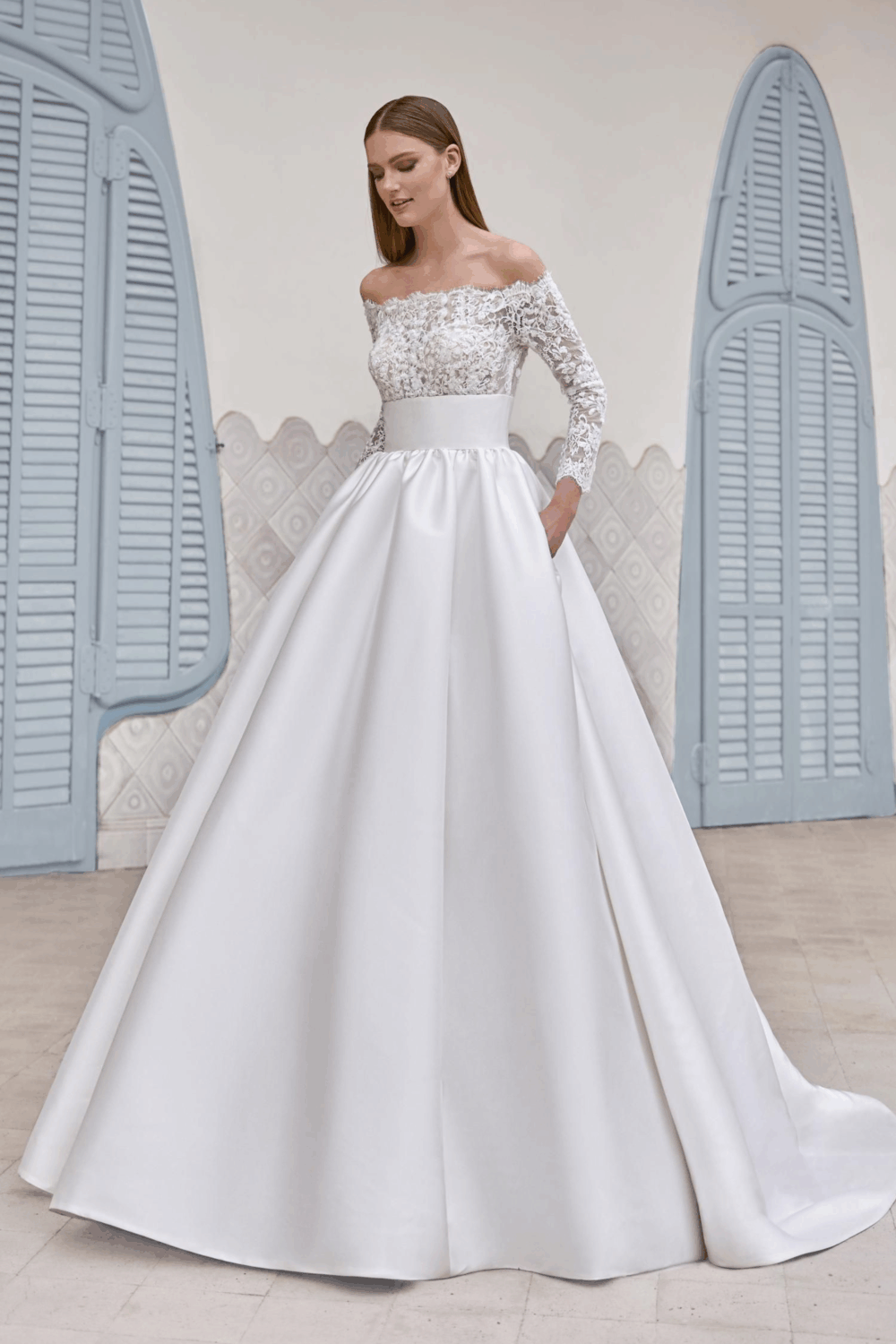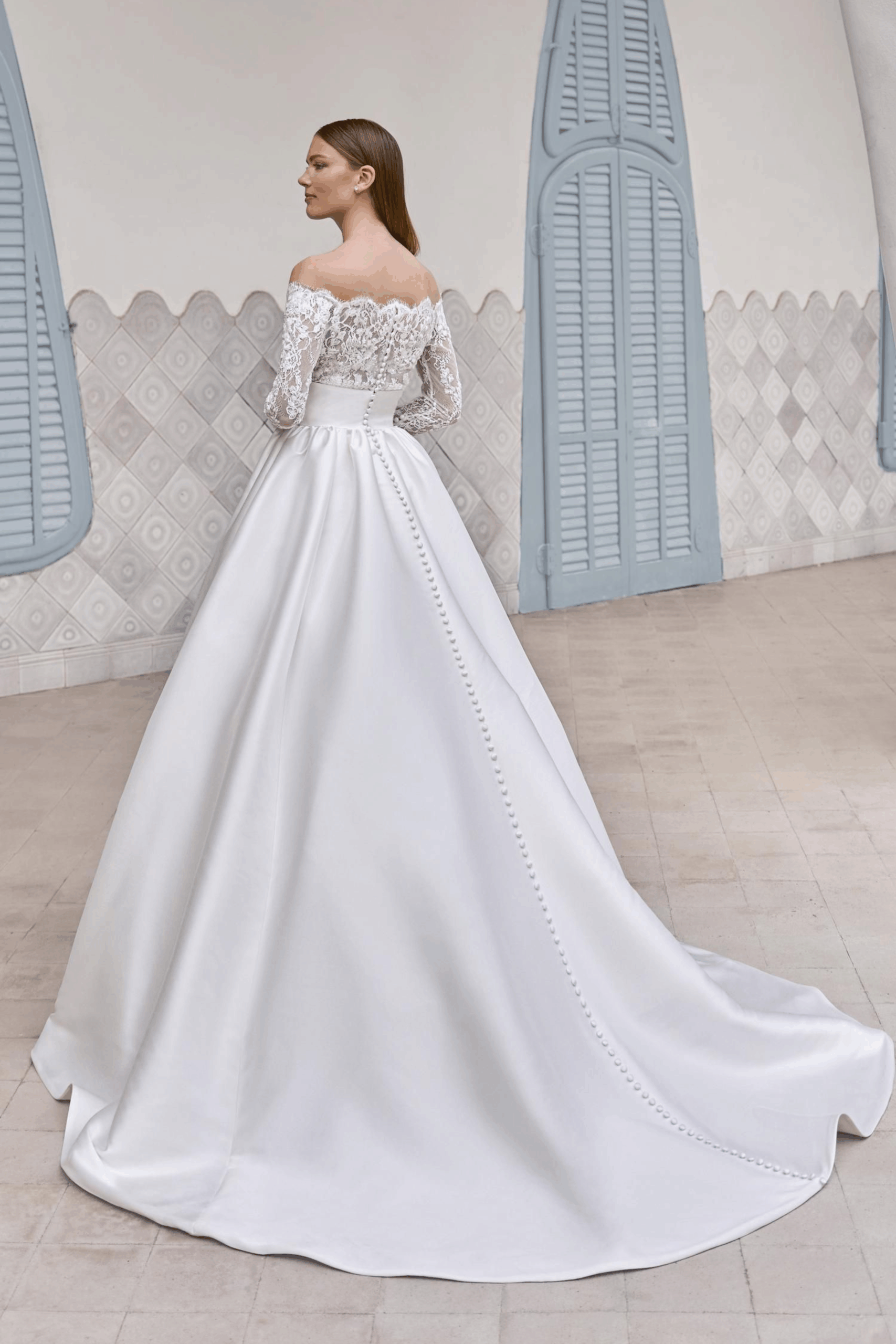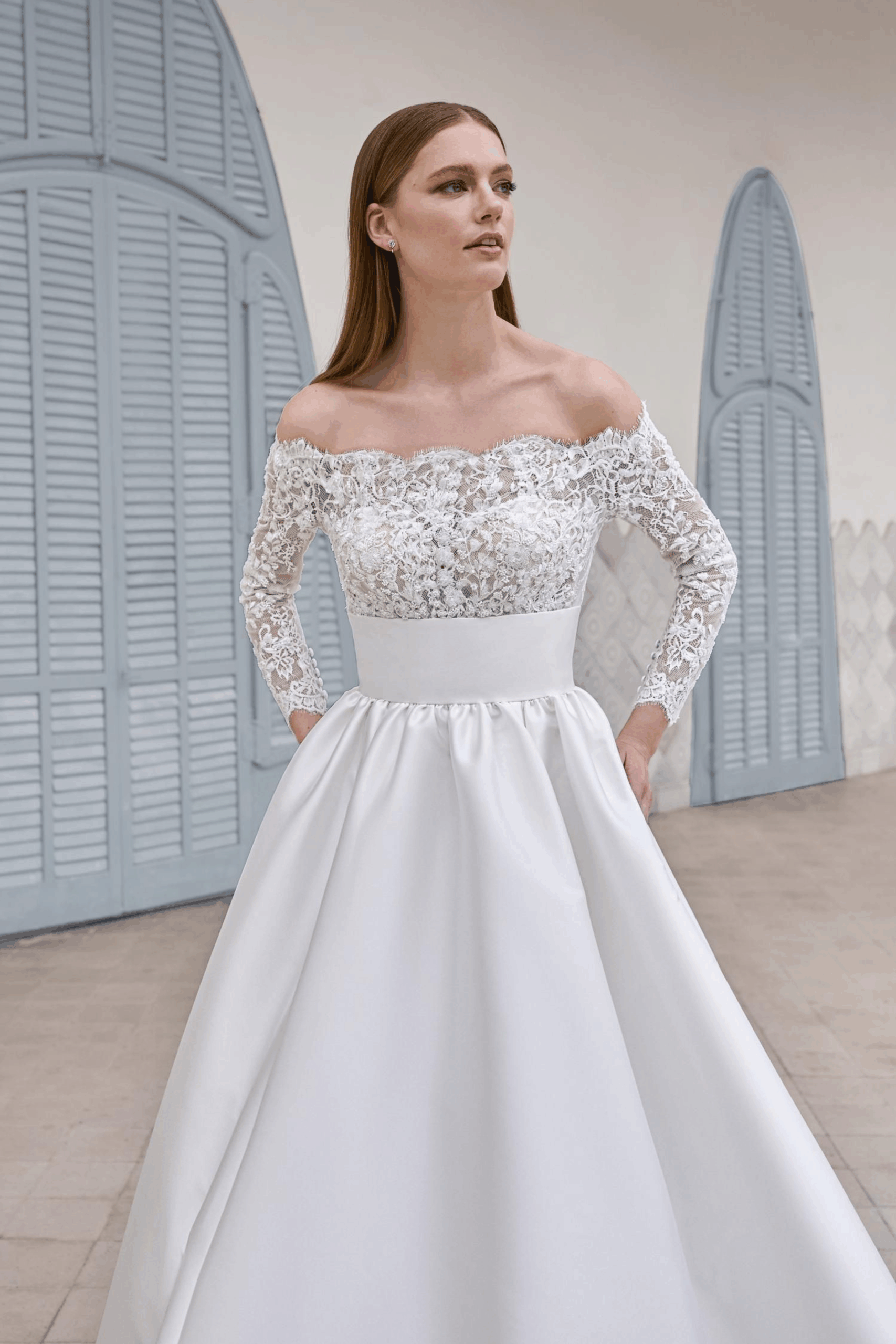 Dieses Prinzessinnenkleid mit Dreiviertelรคrmeln und Off-the-Shoulder-Ausschnitt vereint Struktur und Romantik. Das halbtransparente Spitzenoberteil verschmilzt mit einem voluminรถsen Rock aus weichem Mikado und schafft eine majestรคtische Silhouette mit dezentem Glanz durch Perlen.