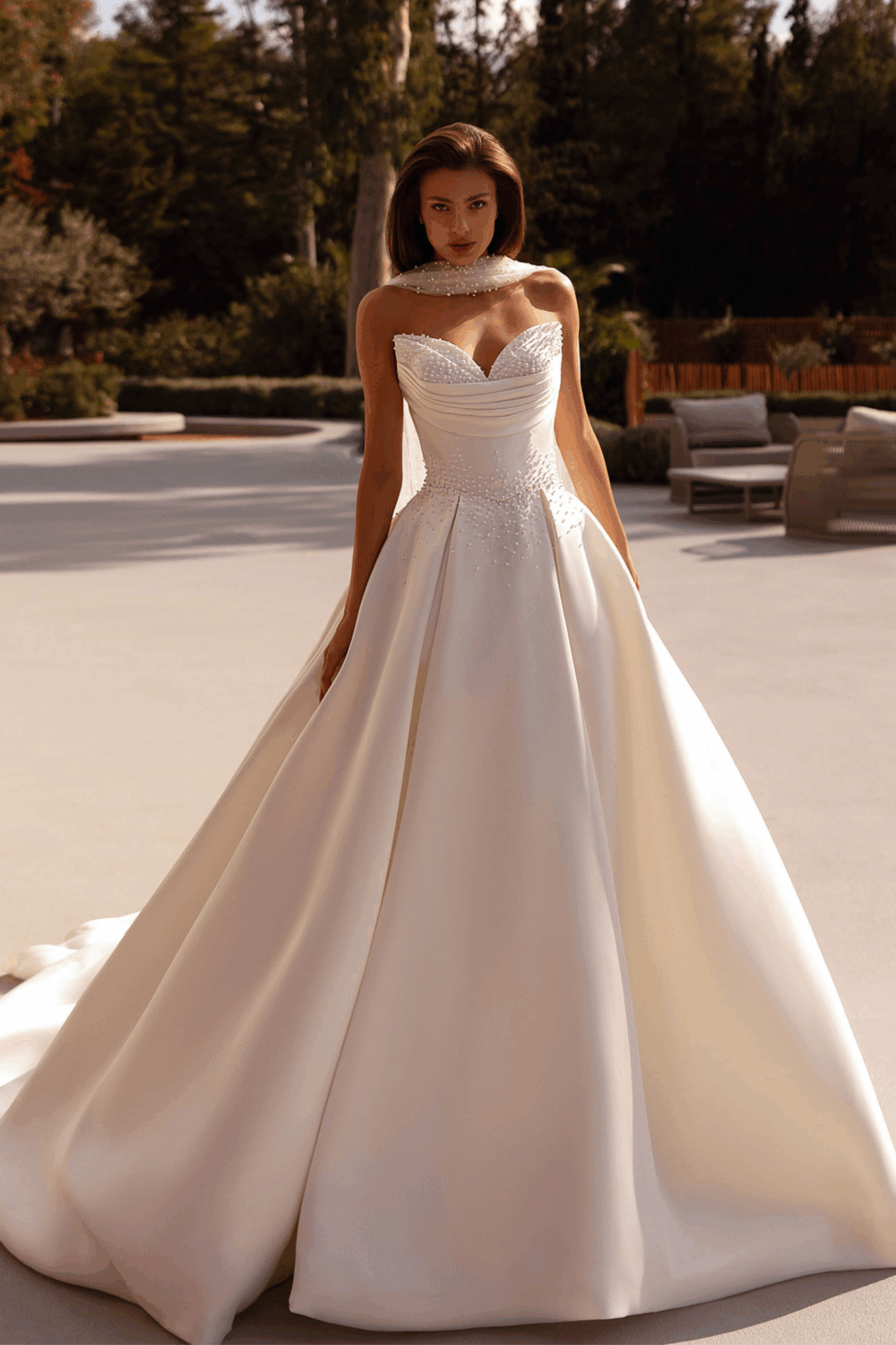 Klassische Eleganz trifft auf modernen Luxus: Dieses eindrucksvolle Brautkleid von Demetrios besticht durch seine glamourรถse Ballkleid-Silhouette aus edlem Mikado-Stoff. Das Herz-Ausschnitt-Mieder mit feinen Perlenverzierungen und sanften Drapierungen betont die Figur auf elegante Weise. Der voluminรถse Rock mit royaler Schleppe verleiht dem Kleid einen majestรคtischen Auftritt โ perfekt fรผr Brรคute, die sich einen unvergesslichen, kรถniglichen Moment wรผnschen.
