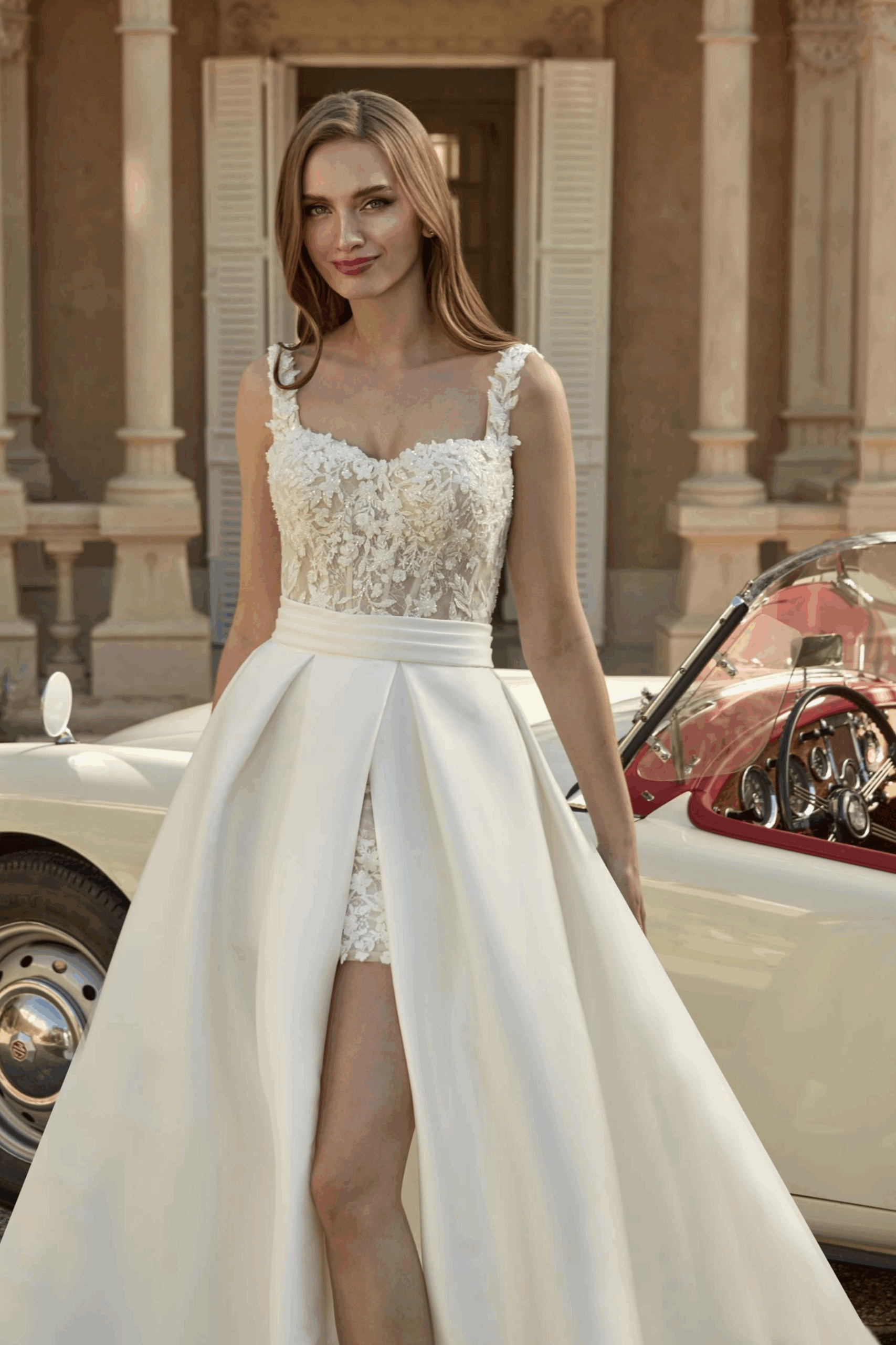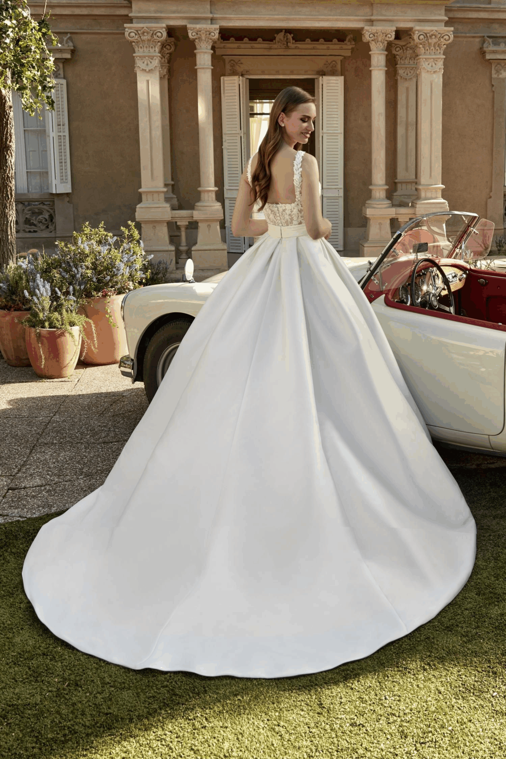 Eine Prinzess-Silhouette, die Mikado-Struktur mit der Leichtigkeit von Tรผll verbindet. Der eckige Ausschnitt verleiht einem klassisch inspirierten Design eine zeitgenรถssische Note.