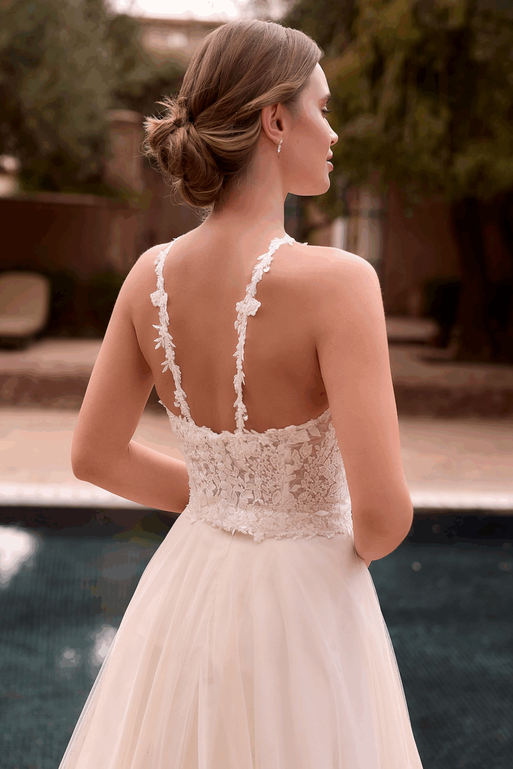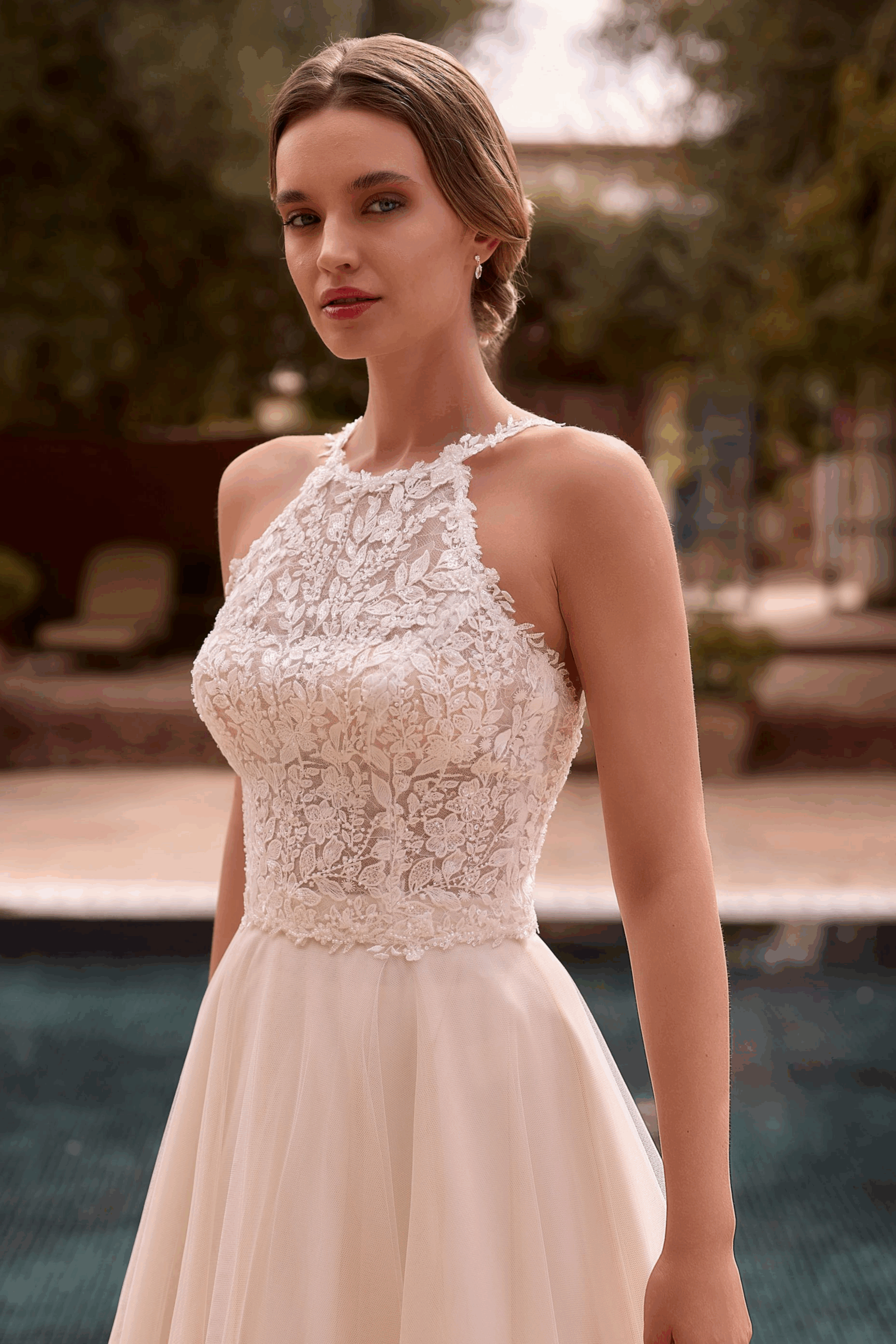 Dieses Braut-Top ist aus hochwertigem Tรผll und Spitze gefertigt. Es verfรผgt รผber einen Neckholder-Ausschnitt. Die Knopfleiste am Rรผcken und der Hakenverschluss sorgen fรผr eine perfekte Passform.