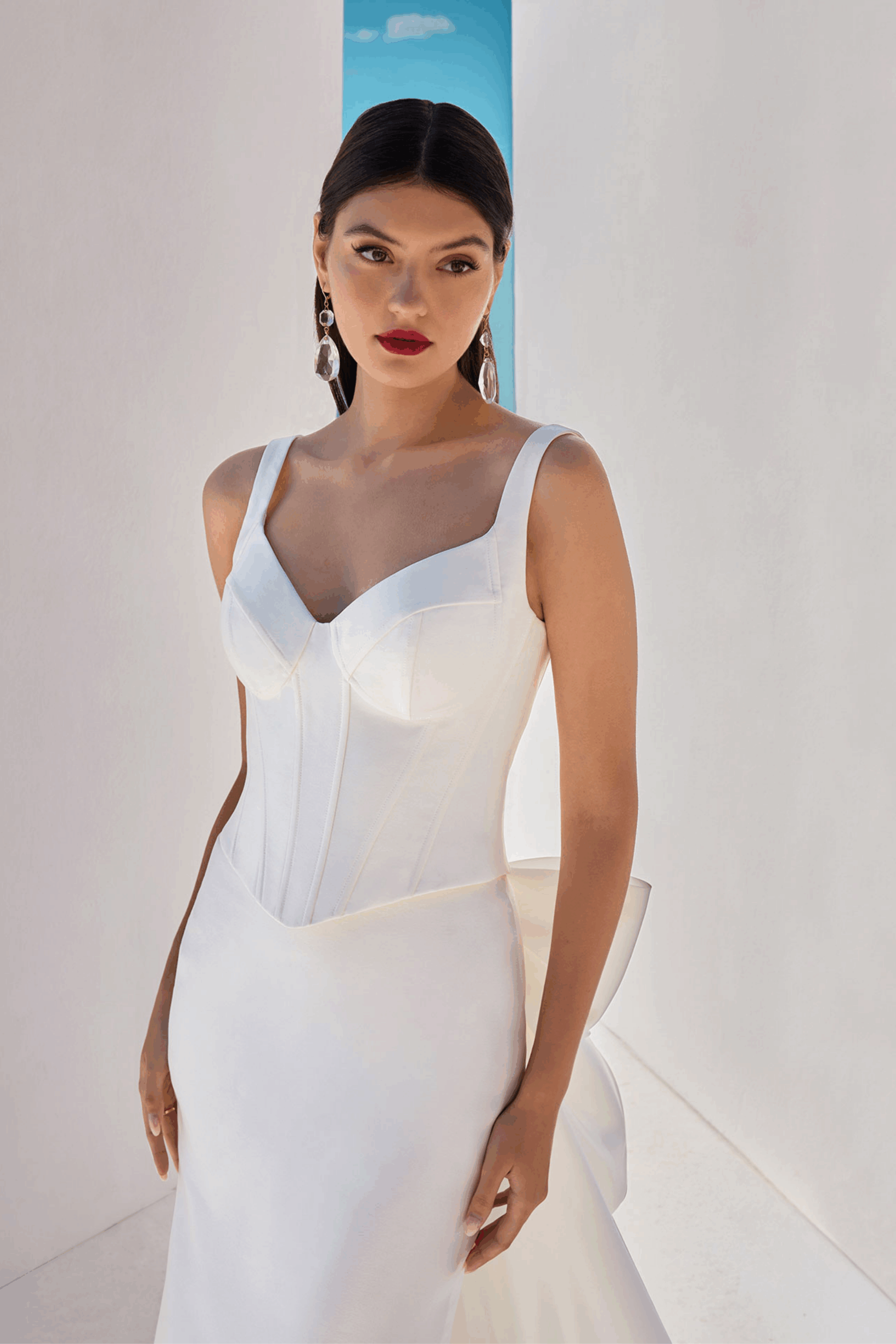 Schlichte Eleganz trifft auf moderne Raffinesse: Das Demetrios Modell besticht durch sein figurbetontes Corsagen-Oberteil im edlen, minimalistischen Stil. Die feinen Stรคbchen-Nรคhte formen eine makellose Silhouette und verleihen dem Design eine subtile Struktur, wรคhrend die klaren Linien und der herzfรถrmige Ausschnitt mit breiten Trรคgern pure Modernitรคt ausstrahlen.