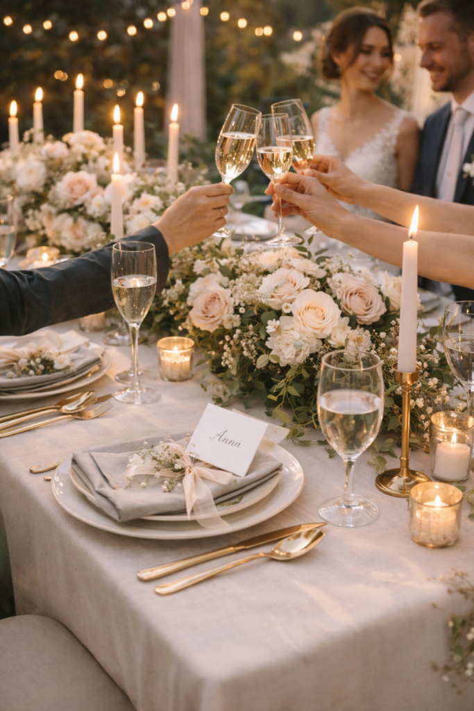 Floristik ist wunderschön, aber auch kostenintensiv. Setze auf saisonale Blumen und arbeite mit Vasen, Lichtern, Stoffen oder Trockenblumen – das schafft Atmosphäre und spart bares Geld. Auch Mietdeko ist eine charmante und günstige Alternative zu aufwendigen Neukäufen.